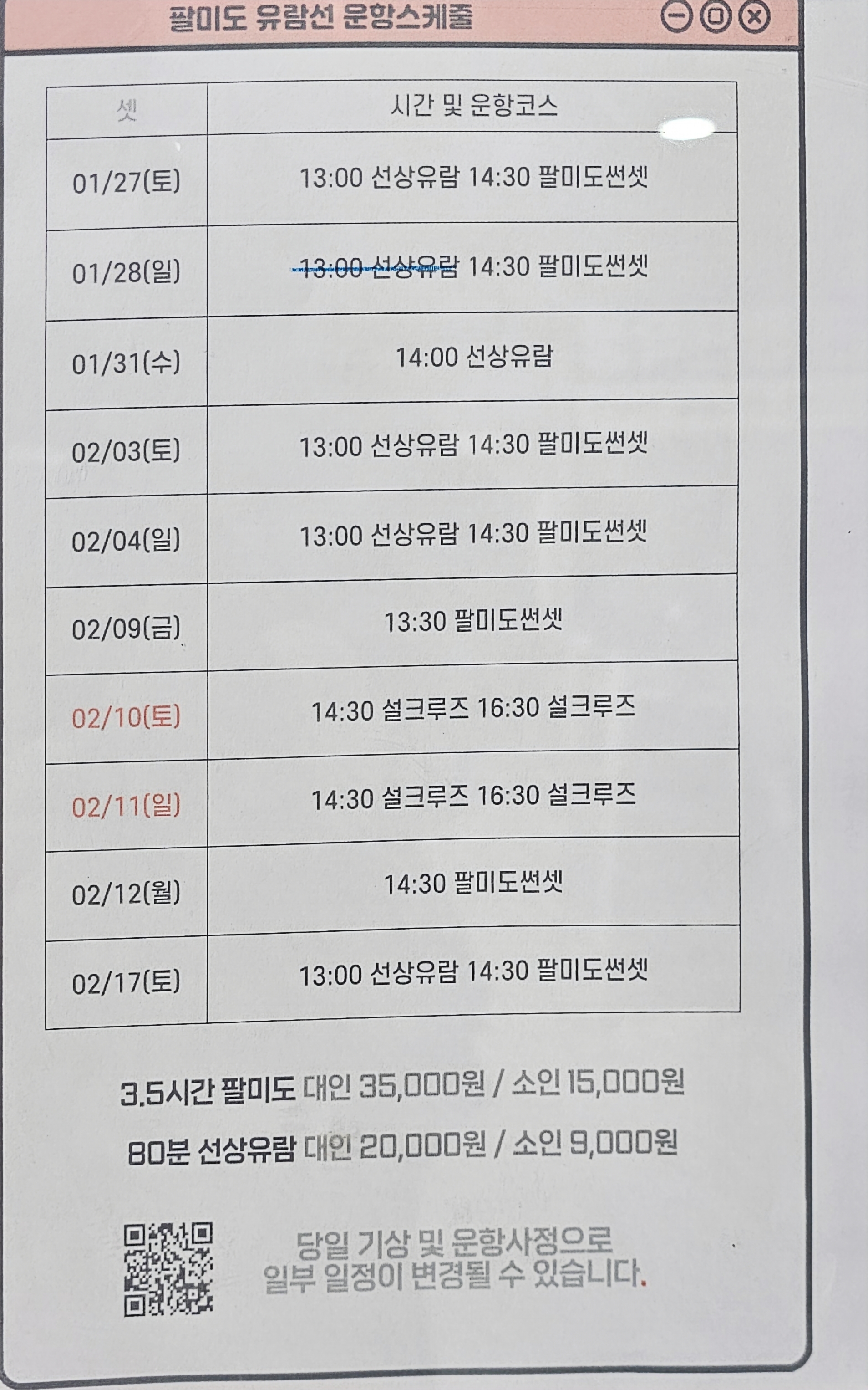2월 이후 유람선 운항 스케줄은 실시간 배 당일 운항정보에서 확인 할 수 있다.