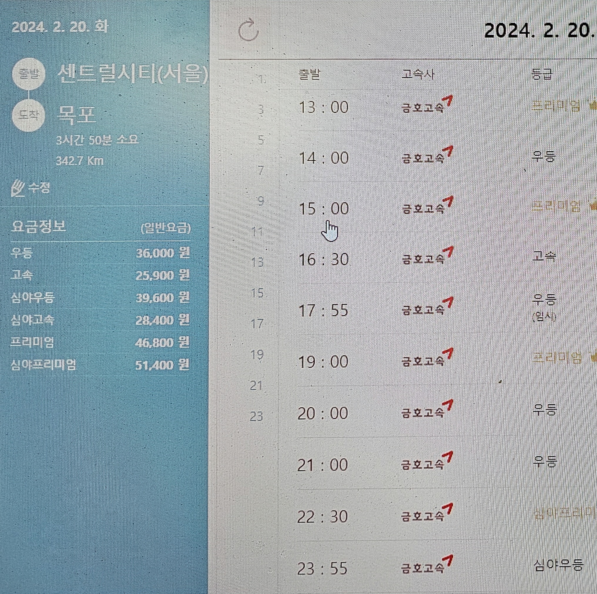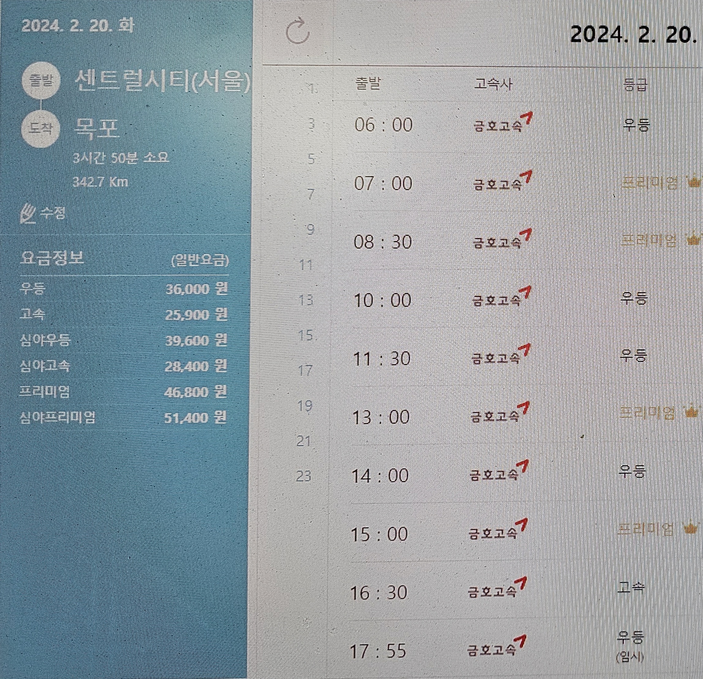 목포까지 요금은 우등이 36,000원이다.