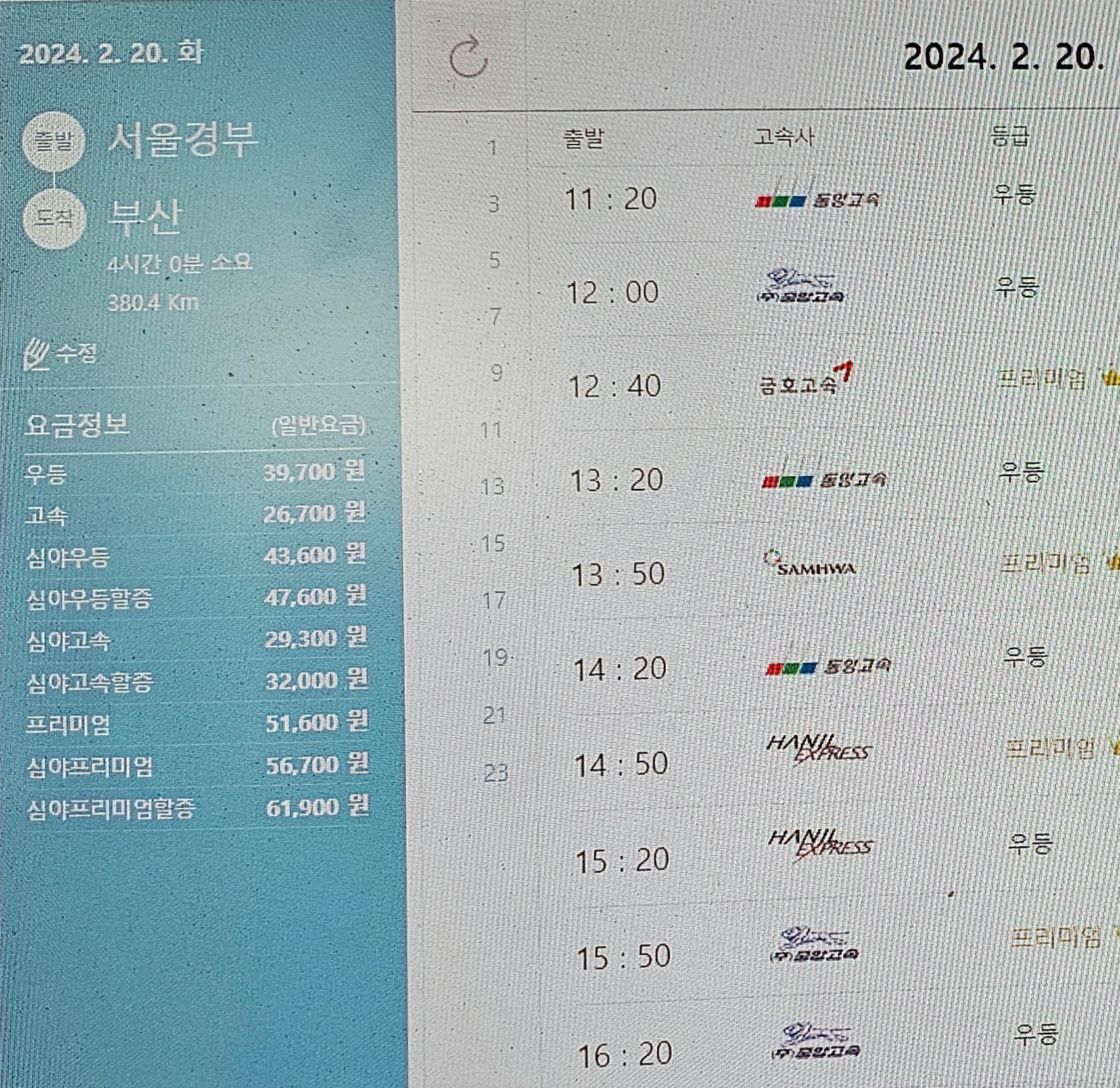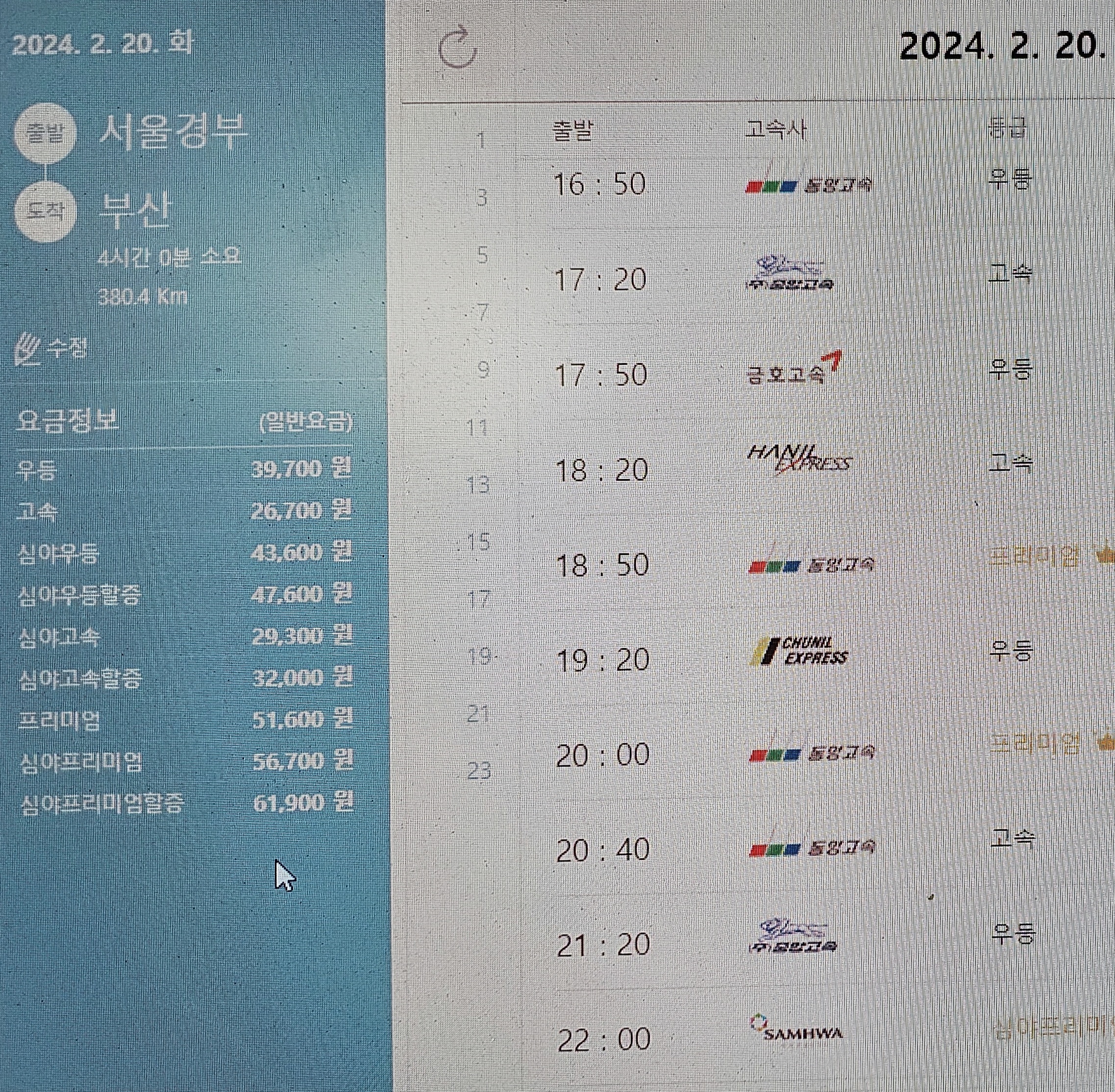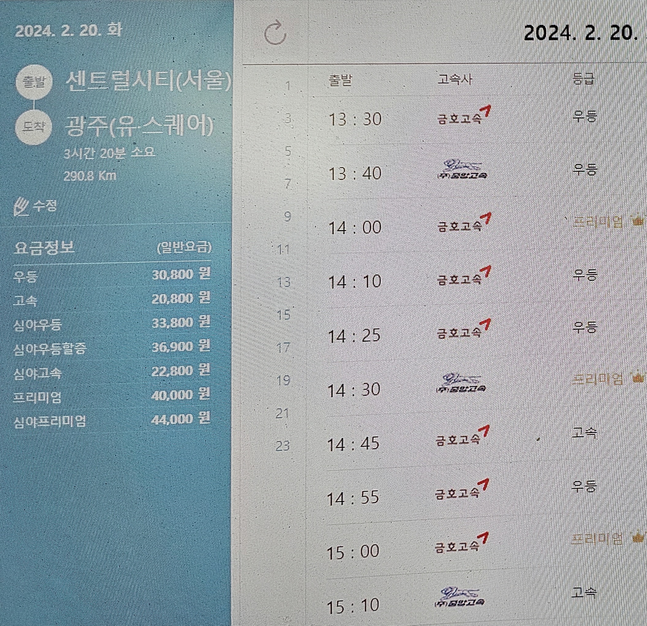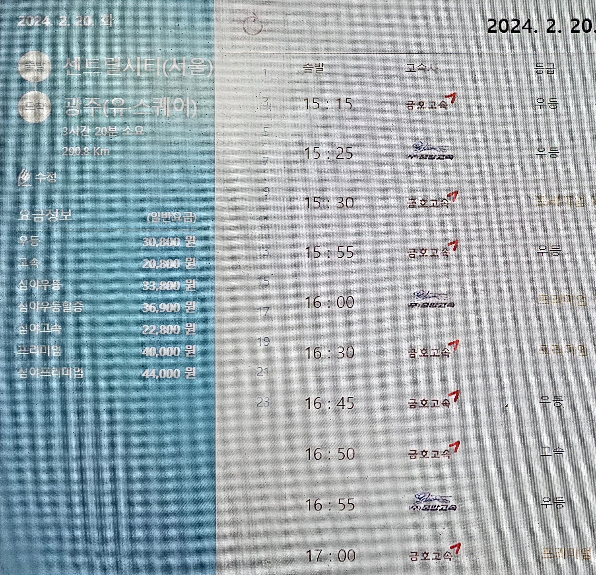 여수까지 우등 요금은 36,400원이다.