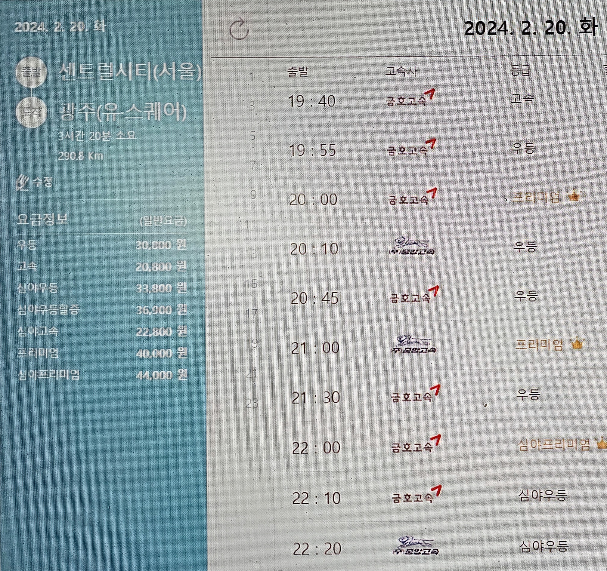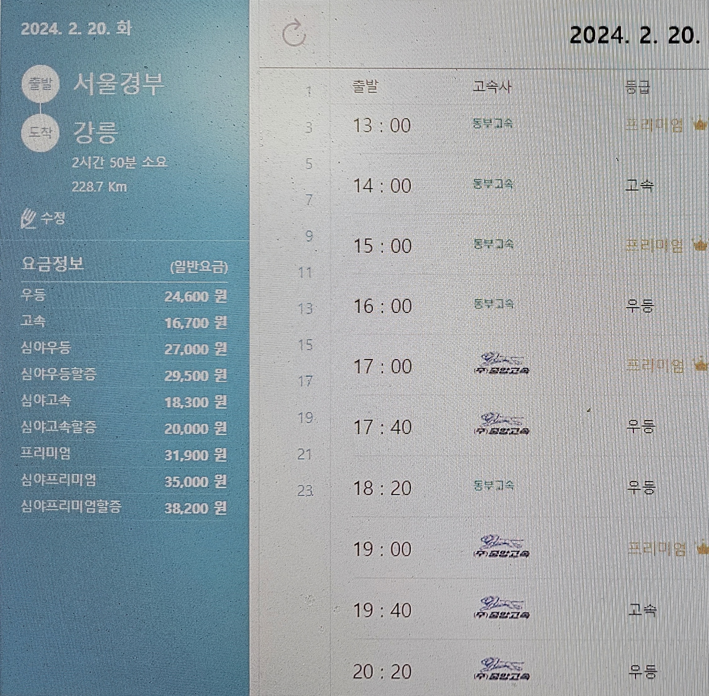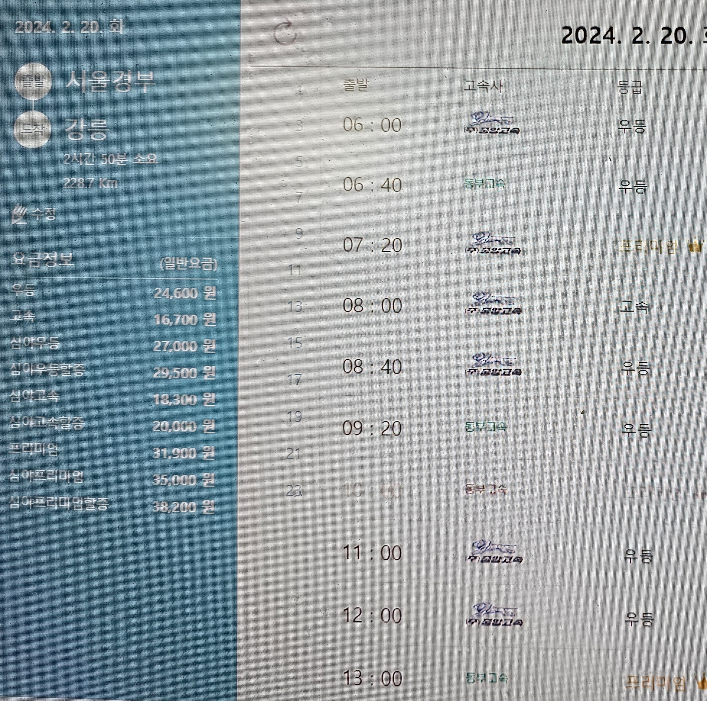 강릉까지 우등 요금은 24,600원이고,막차는 23시에 프리미엄 버스가 운행된다.