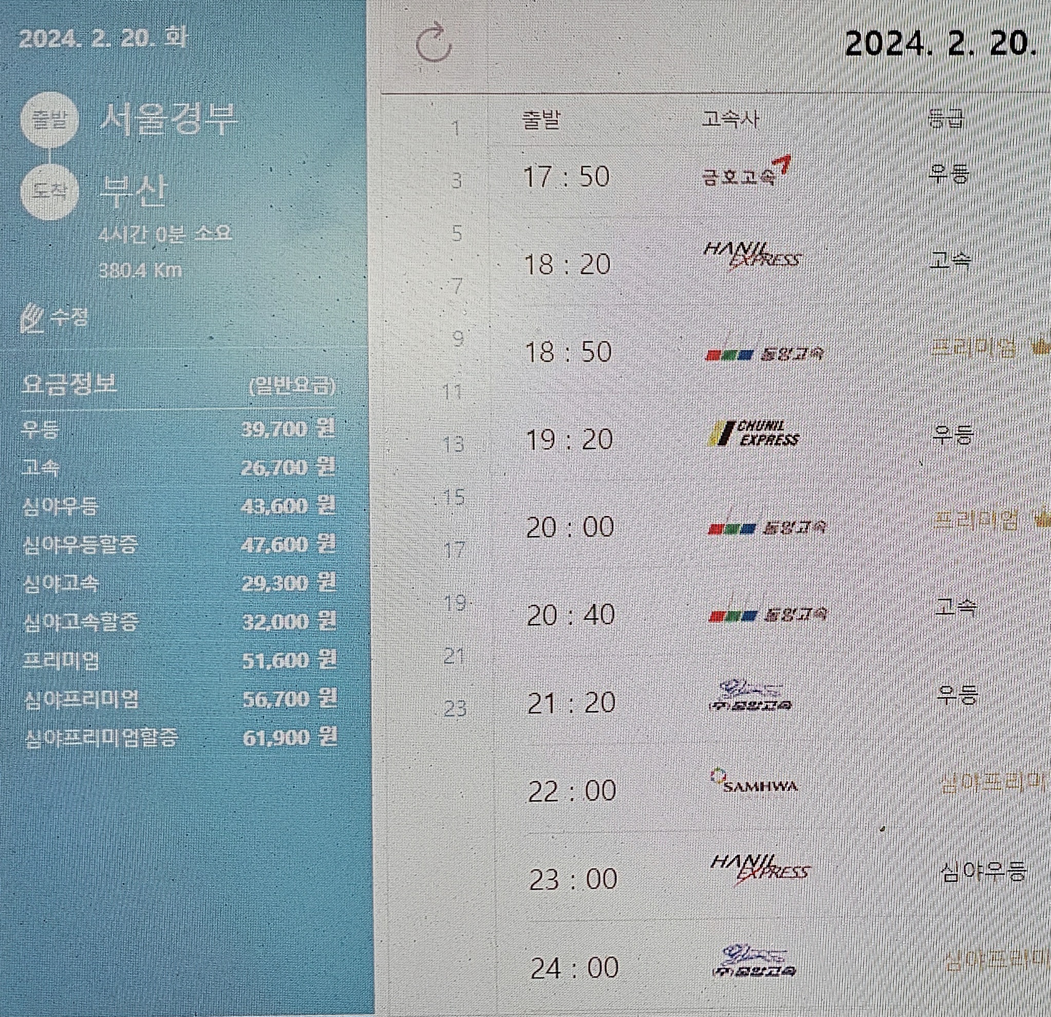 ■서울고속버스터미널 경부 시간표(2024년 2월 20일 기준)