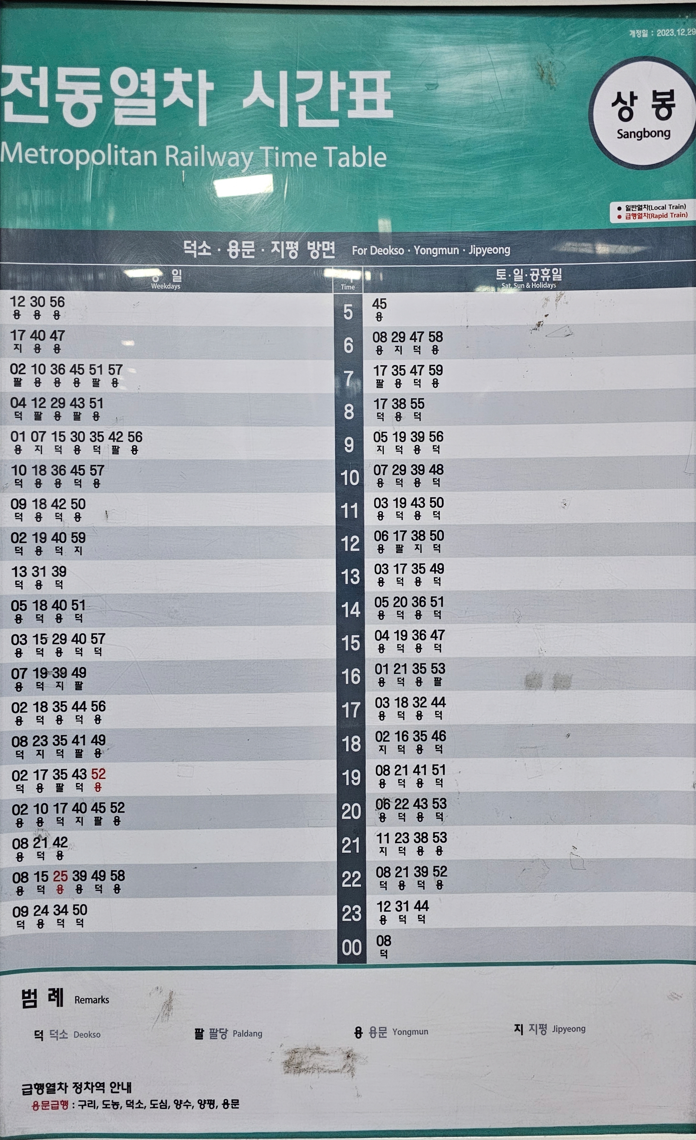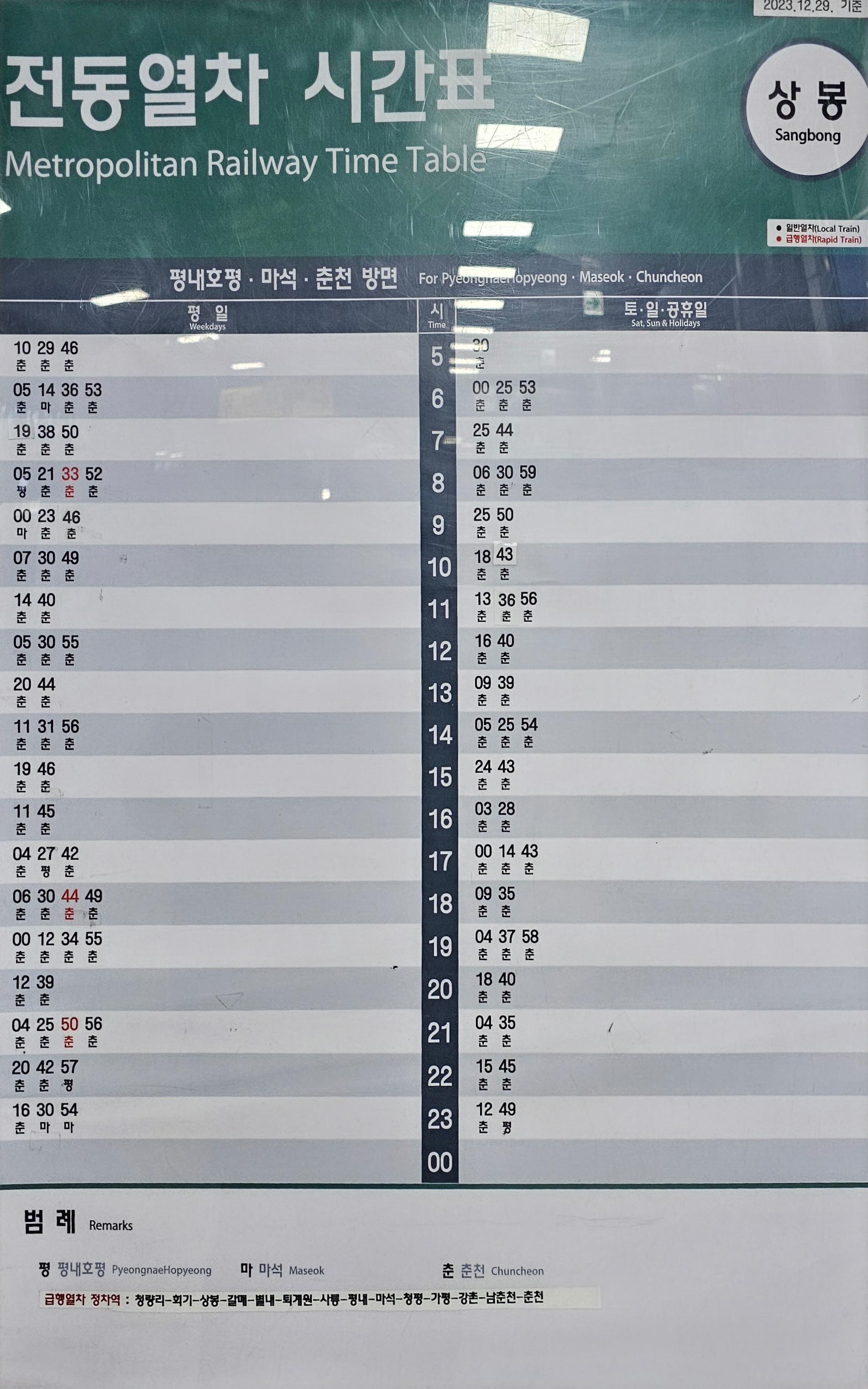 상봉역에 정차하는 경의 중앙선 전철 시간표는 최종적으로 2023년 12월 29일 시간표가 변경되어 현재와 동일하게 운행되고 있다