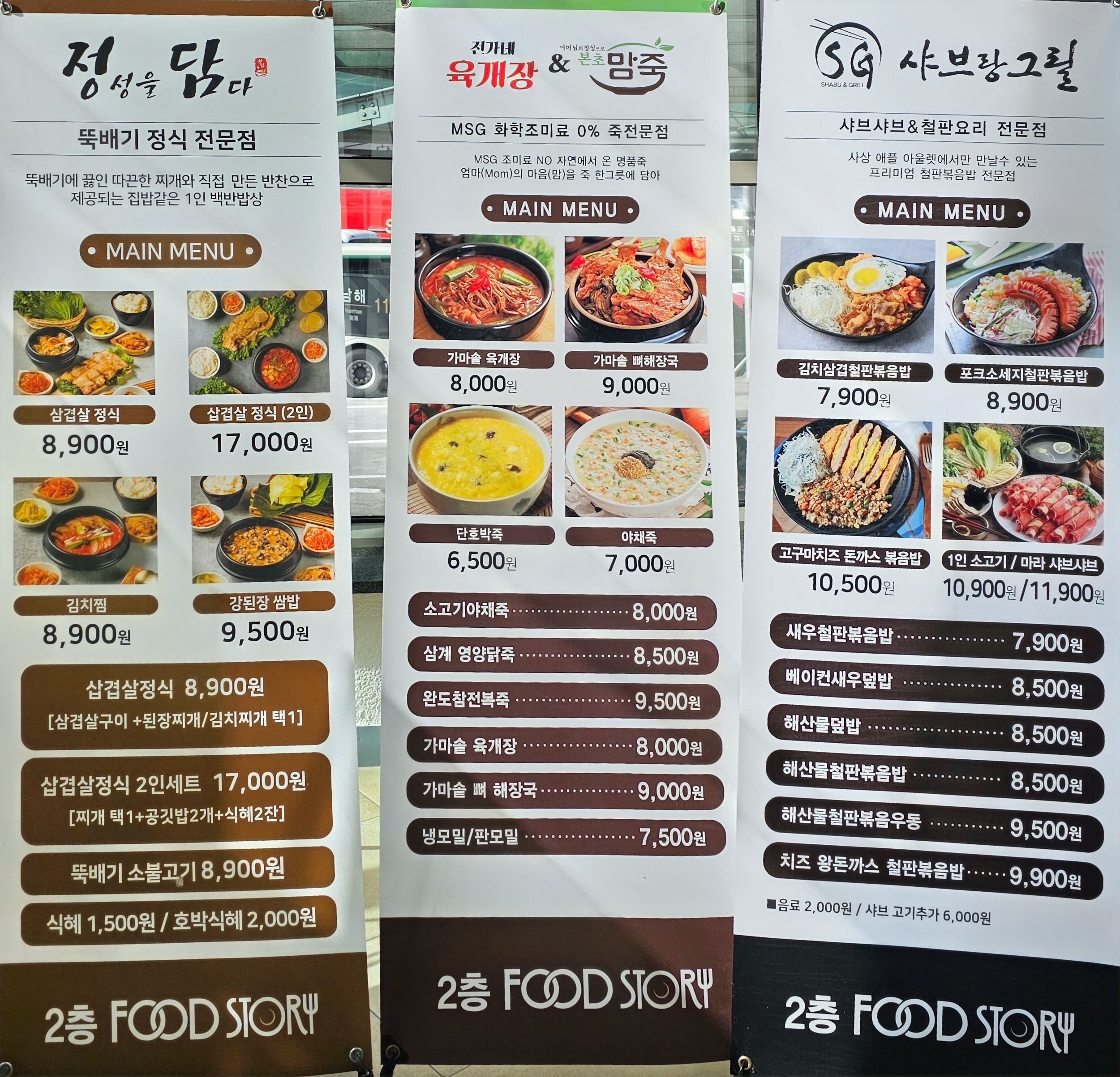 2층 푸드코트 식당가에는 수제비,돈까스,가마솥 국밥,스시,된장찌게 불백,냉면,만두,충무김밥,스테이크,비빔밥,월남쌈,라멘,고기덥밥 등의 메뉴로 맛집이 입점해서 영업을 하고 있다.