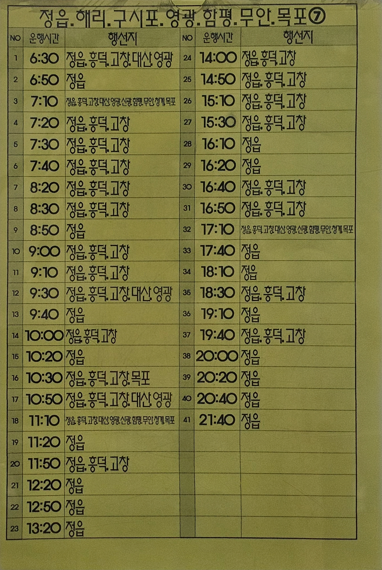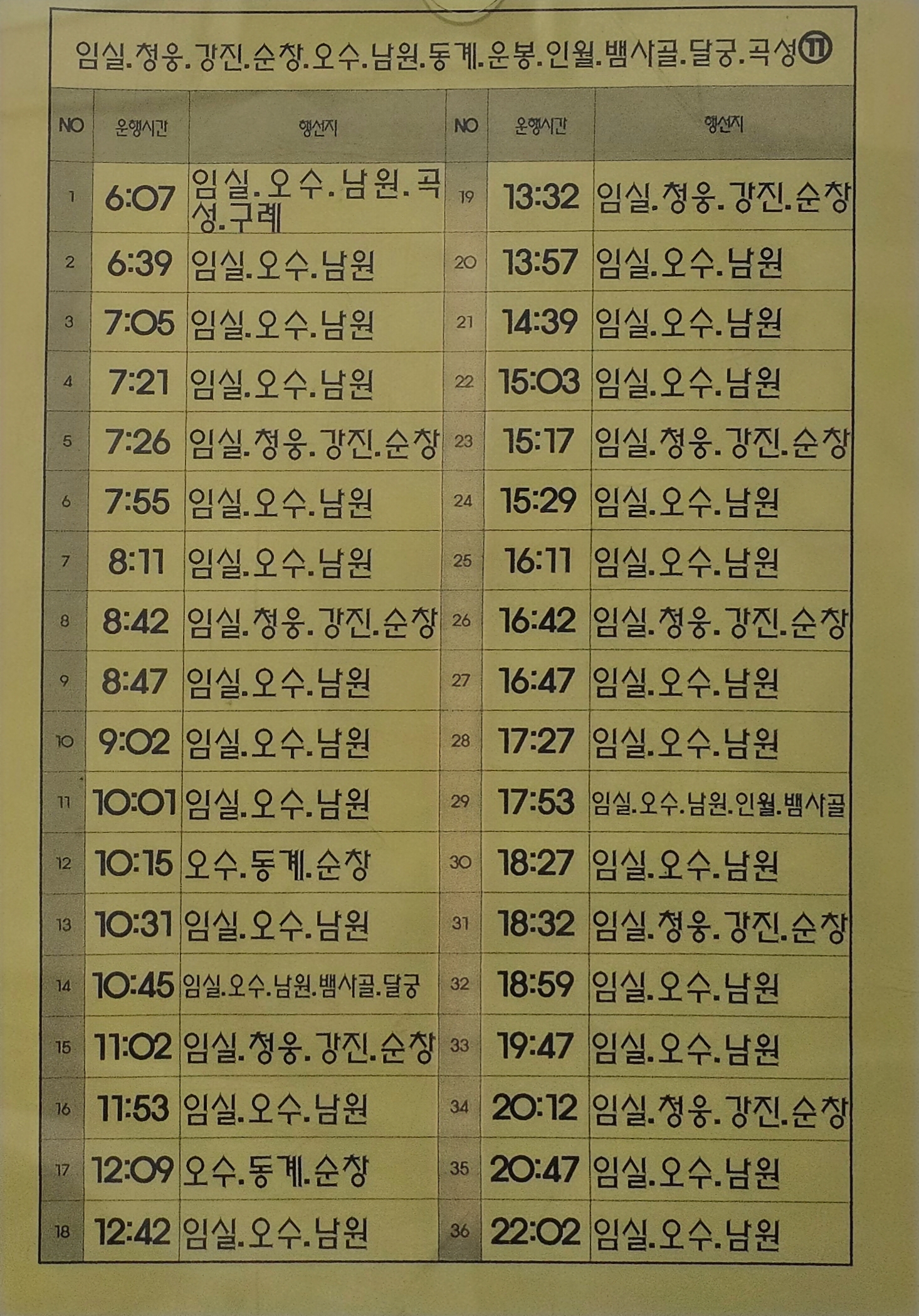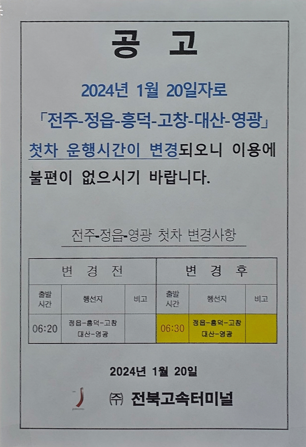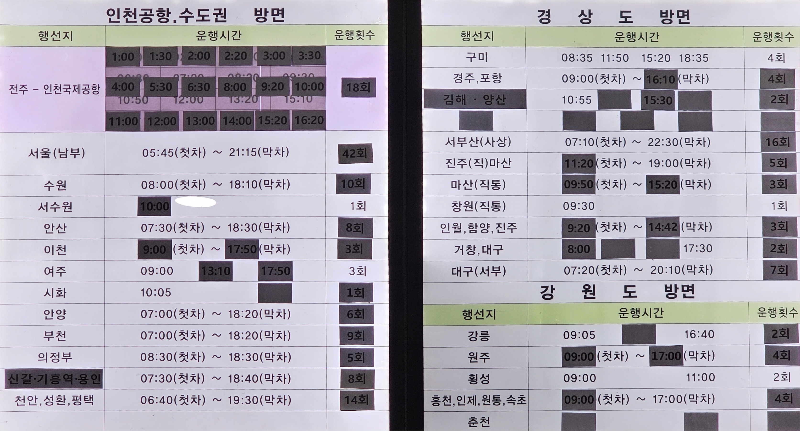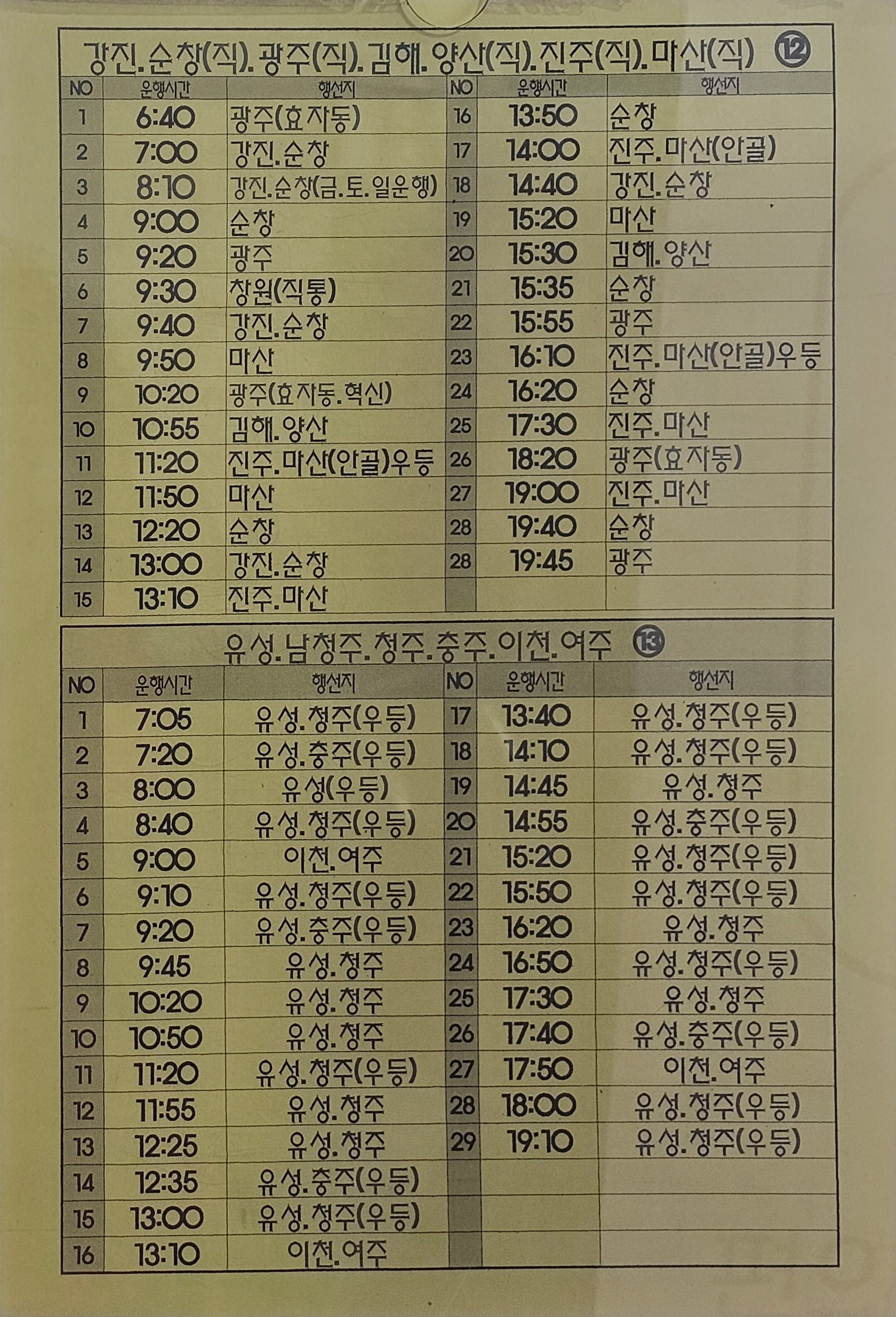 전주에서 광주(효자동)가는 첫차는 06시40분,강진,순창은 07시에 운행한다.