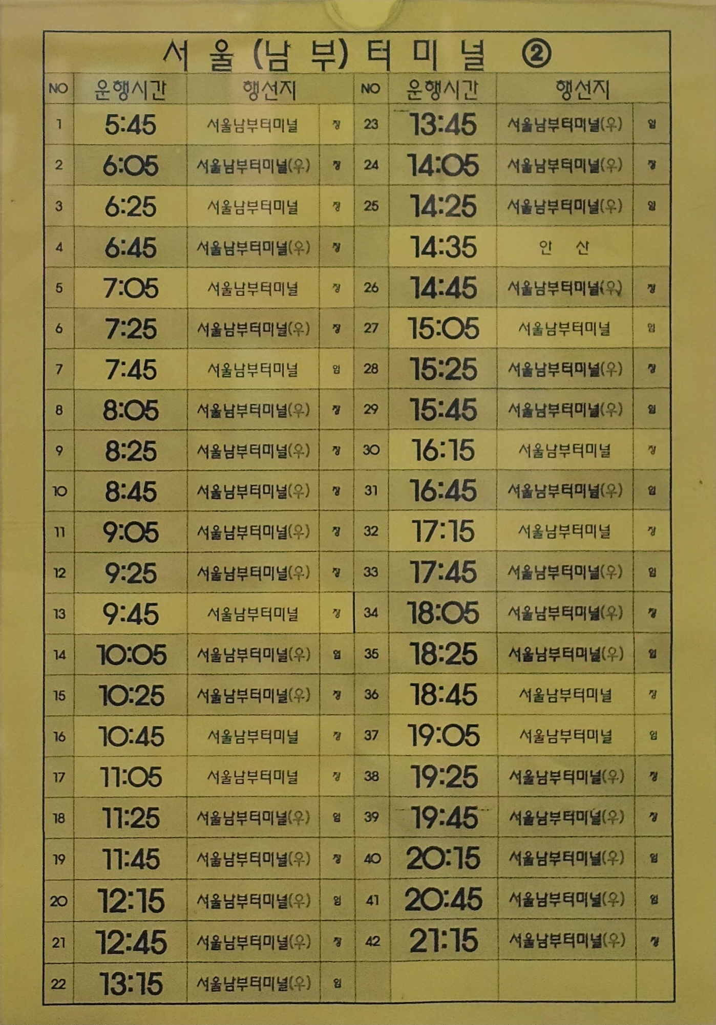 전주시외버스터미널에서 서울 서초구에 위치한 남부터미널가는 첫차는 05시45분,막차는 21시15분에 전주를 출발한다