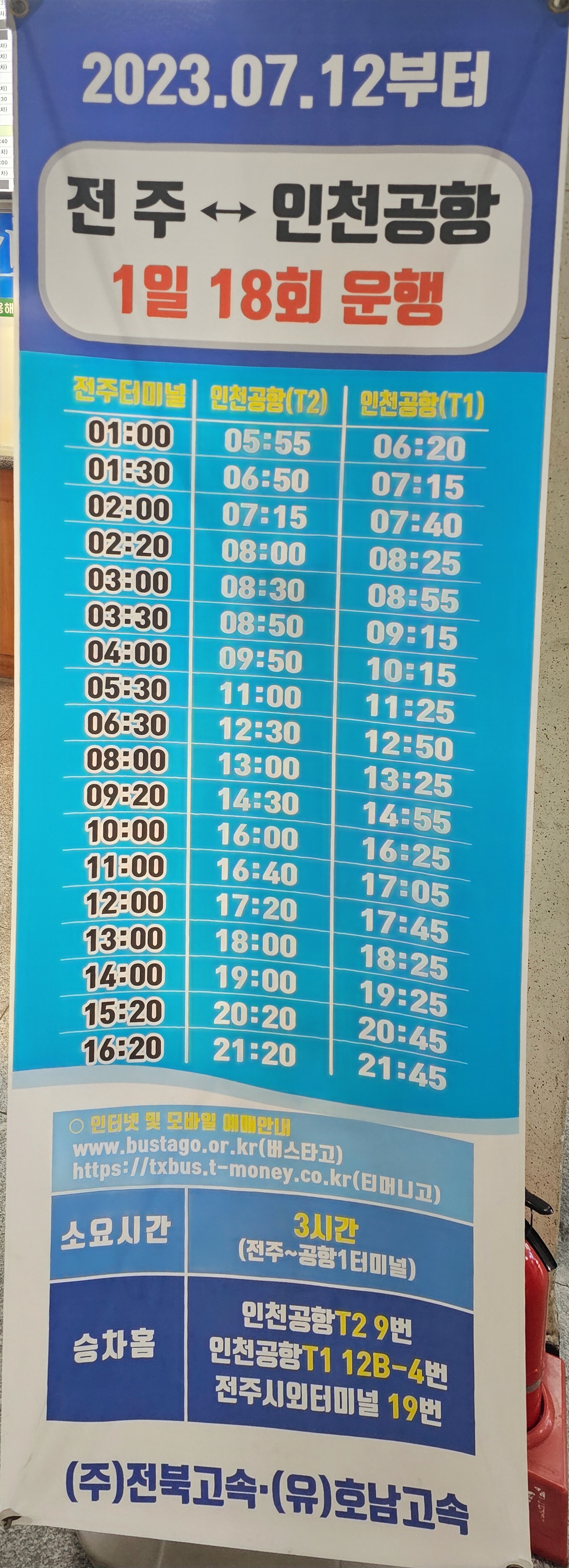2024년 3월 15일 현재 전주시외버스터미널에서 인천공항 가는 버스는 하루에 18회 운행되고,첫차는 01시,막차는 16시20분 운행한다.