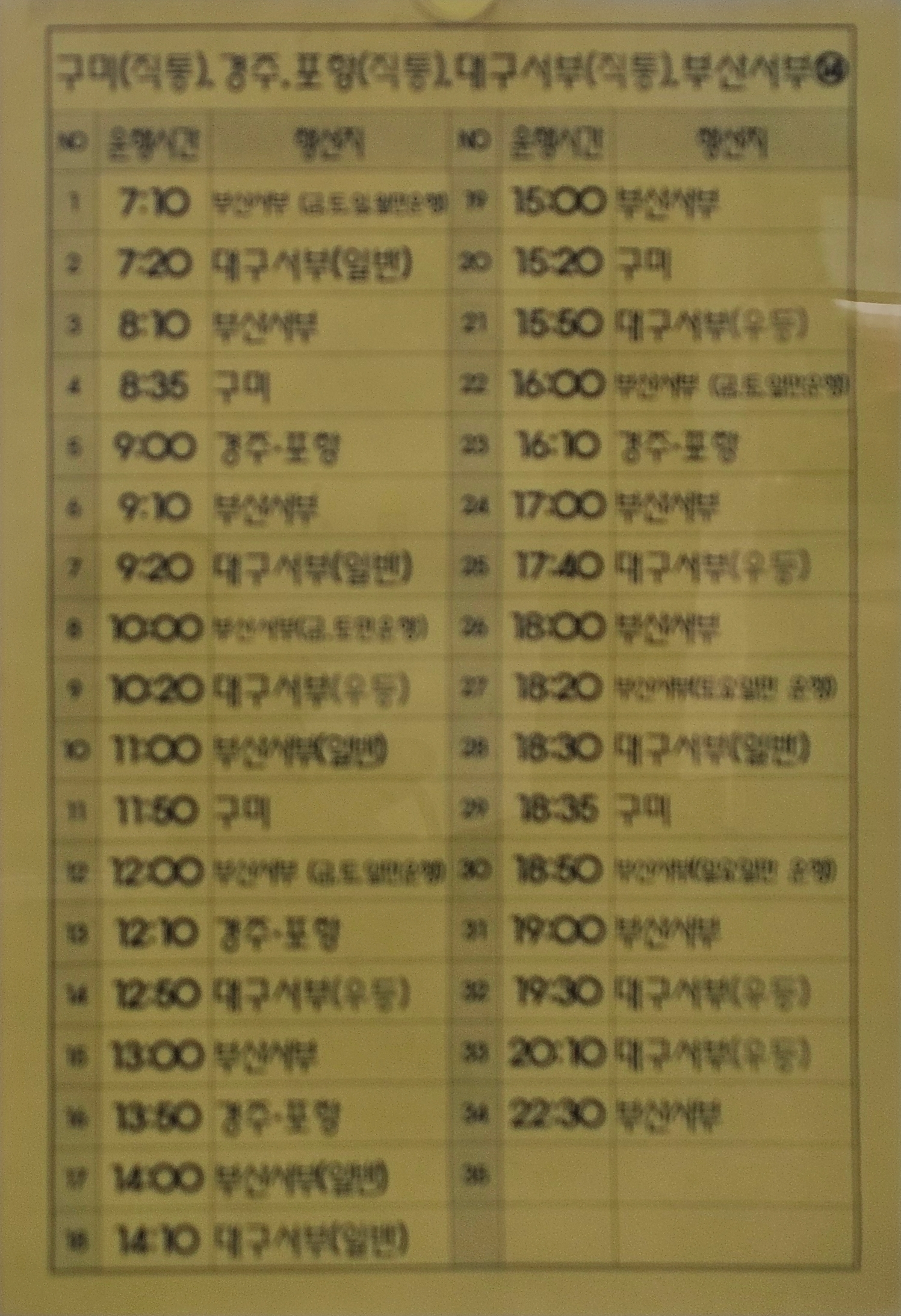 전주시외버스공용터미널에서 대구서부가는 첫차는 07시20분,구미는 08시35분,경주포항은 09시에 첫차가 운행한다.