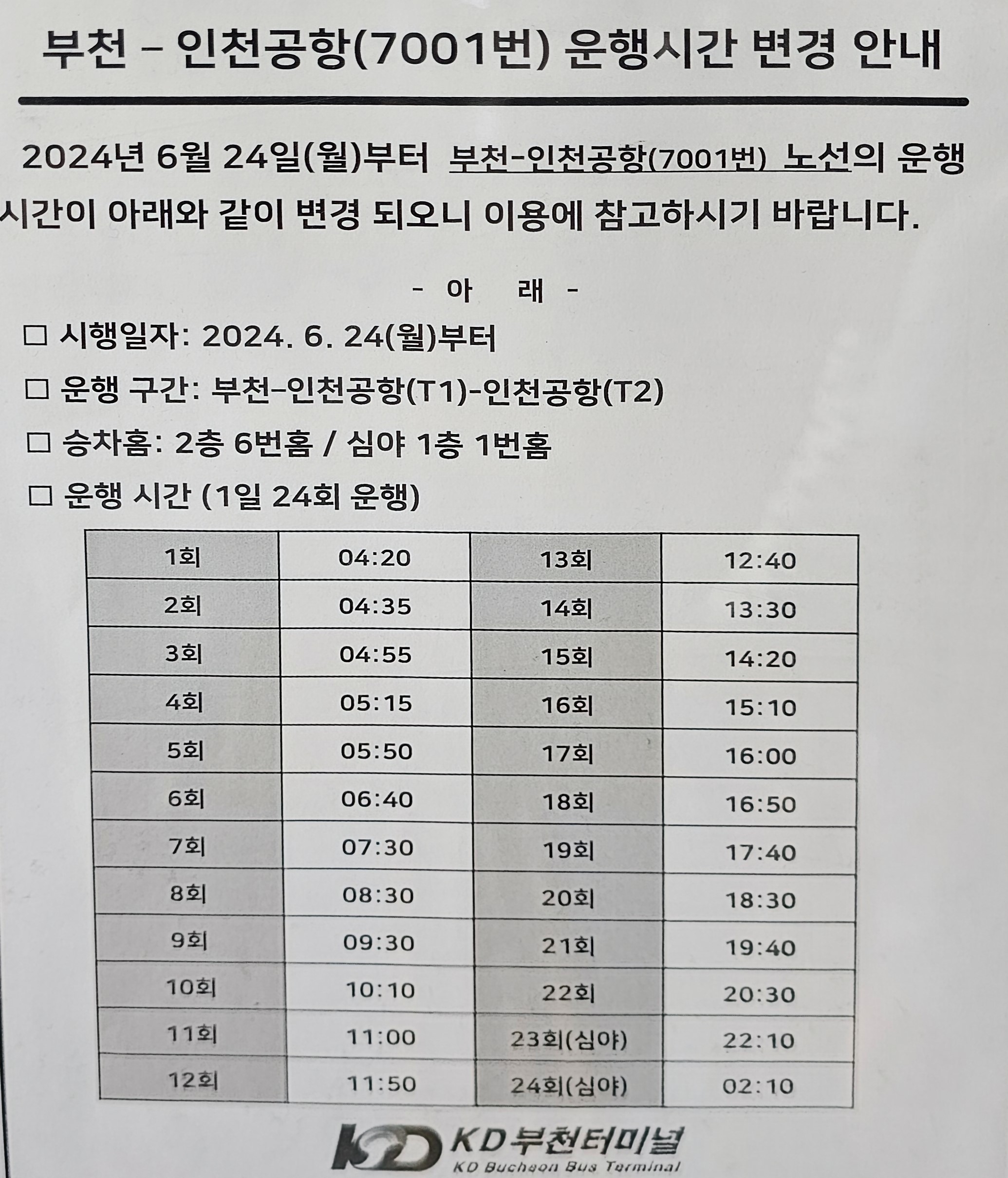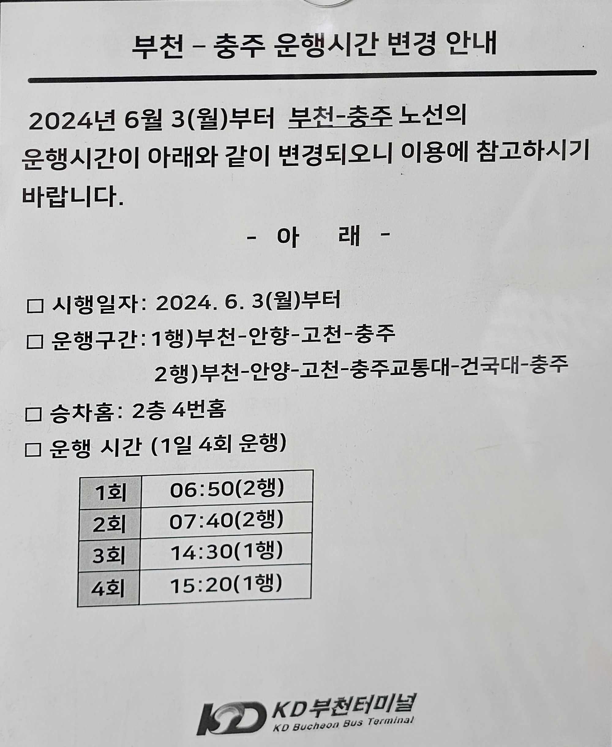 부천소풍터미널에서 유성 구간을 운행하는 노선은 6월 20일부터 변경되어 1일 1회 07시20분에 운행한다.