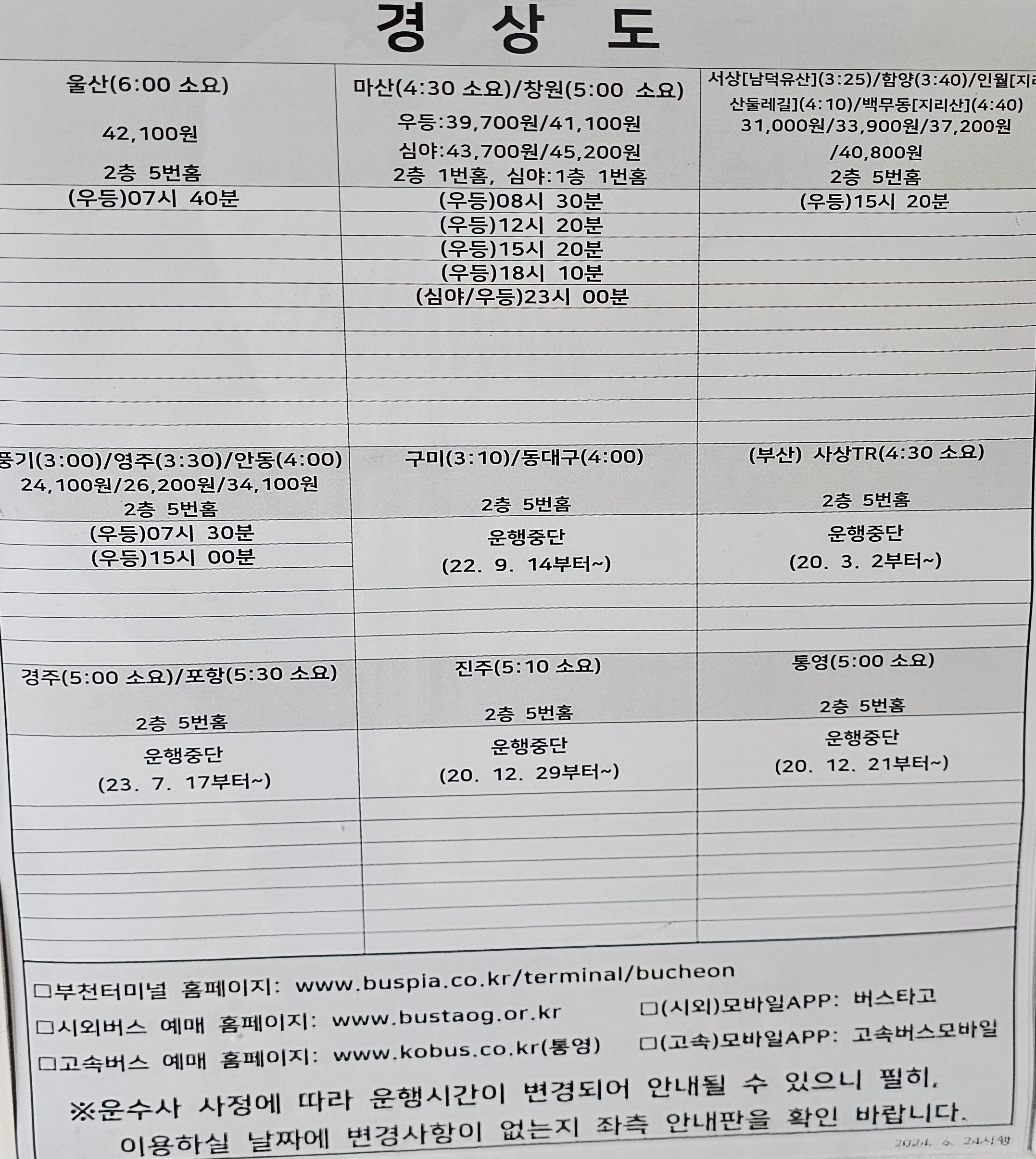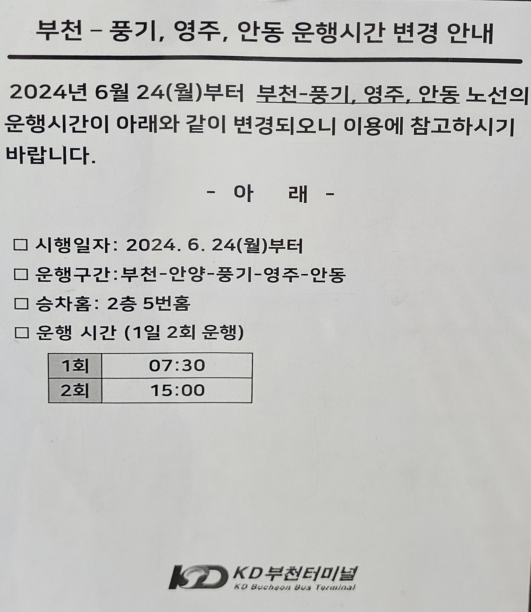 부천소퐁터미널에서 풍기,영주,안동 노선은 6월 24일부터 시간표가 변경되어 1일 2회 07시30분,15시에 운행되고 있으며,