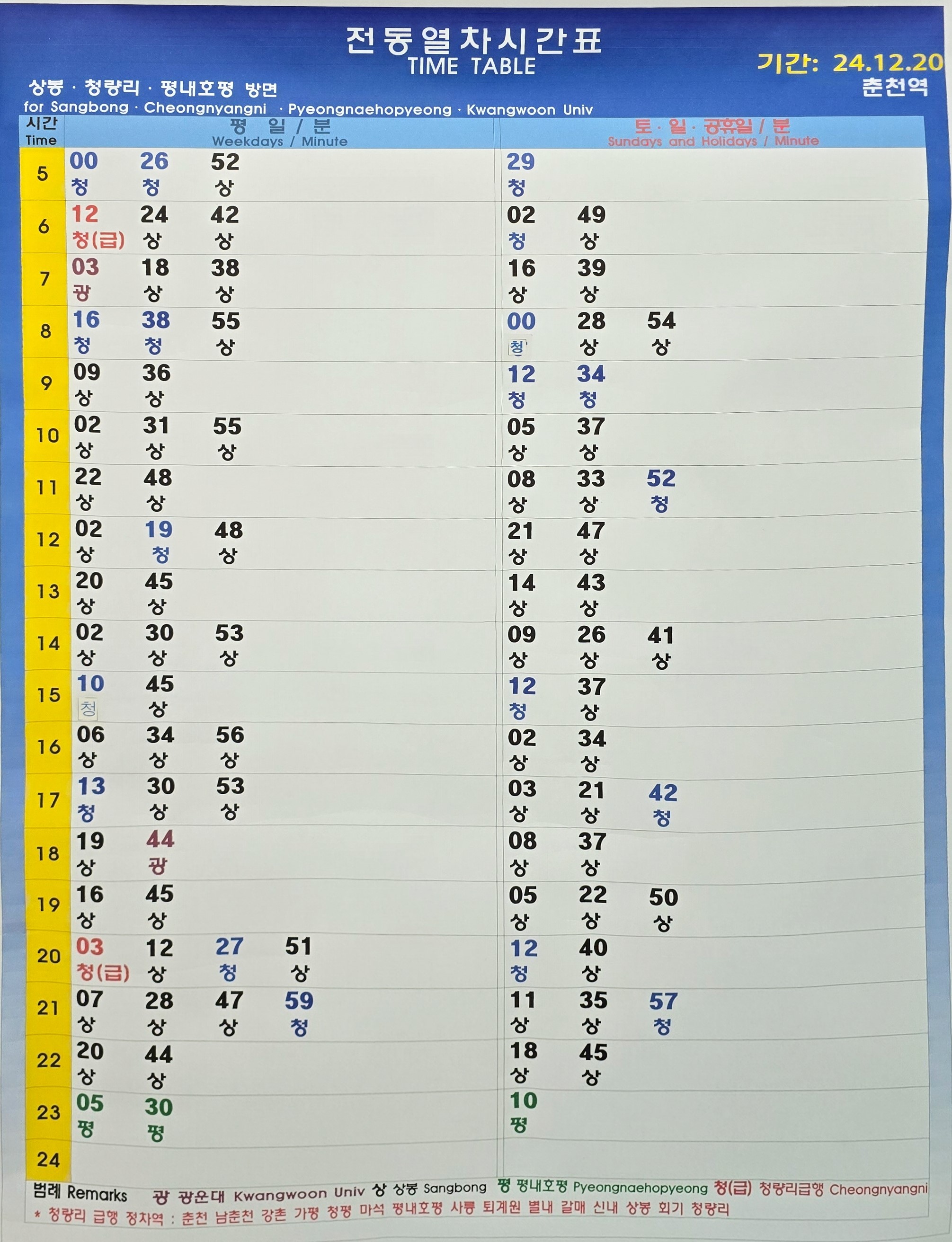 춘천역의 경춘선 전철 시간표는 최종적으로 2024년 12월 20일 변경되어 현재는 이와 동일한 시간표로 운행되고 있다.