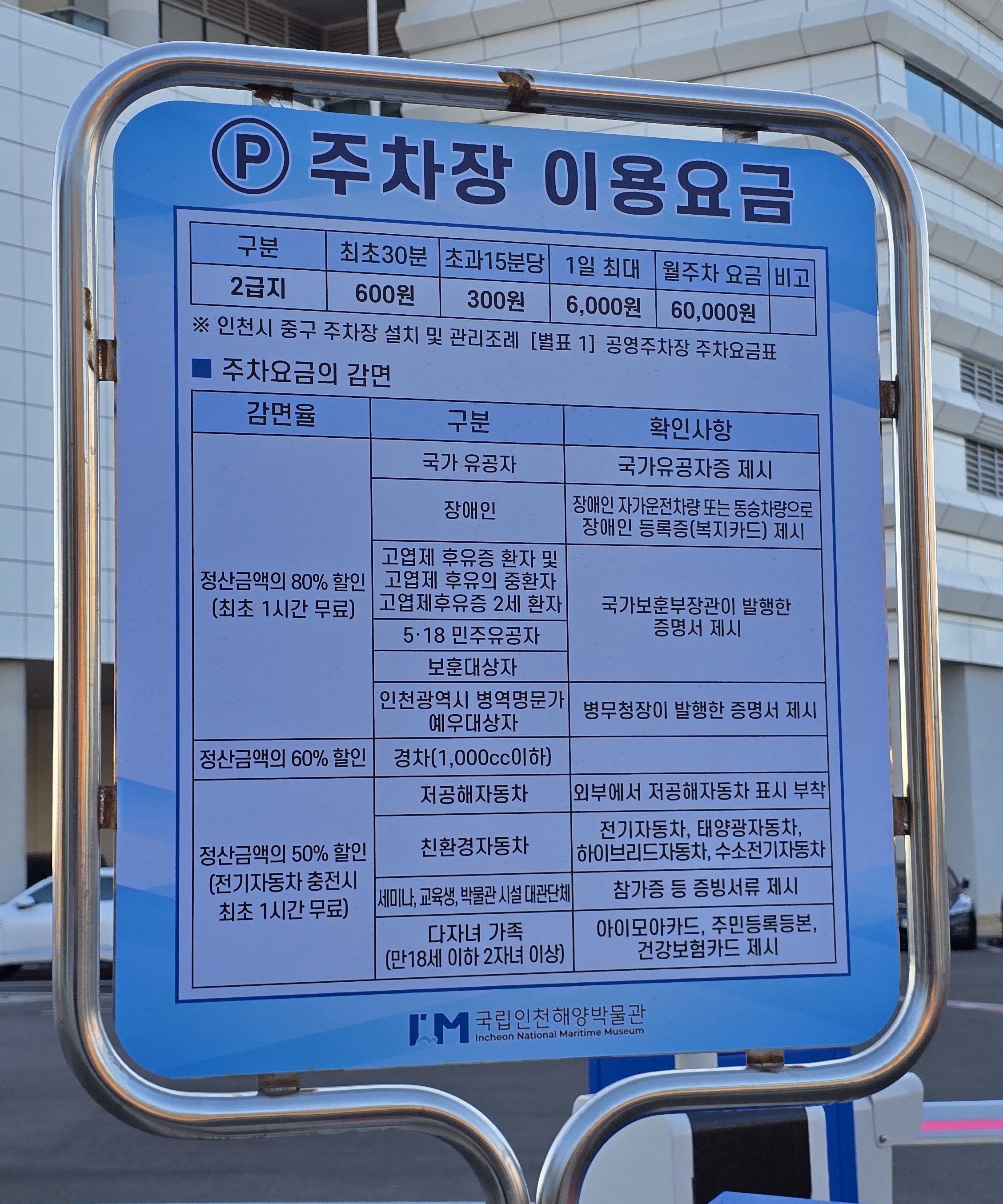 국립인천해양 박물관 주차장 이용요금은 최초 30분은 600원,초과 15분당 300원이고 1일 최대는 6,000원이다.