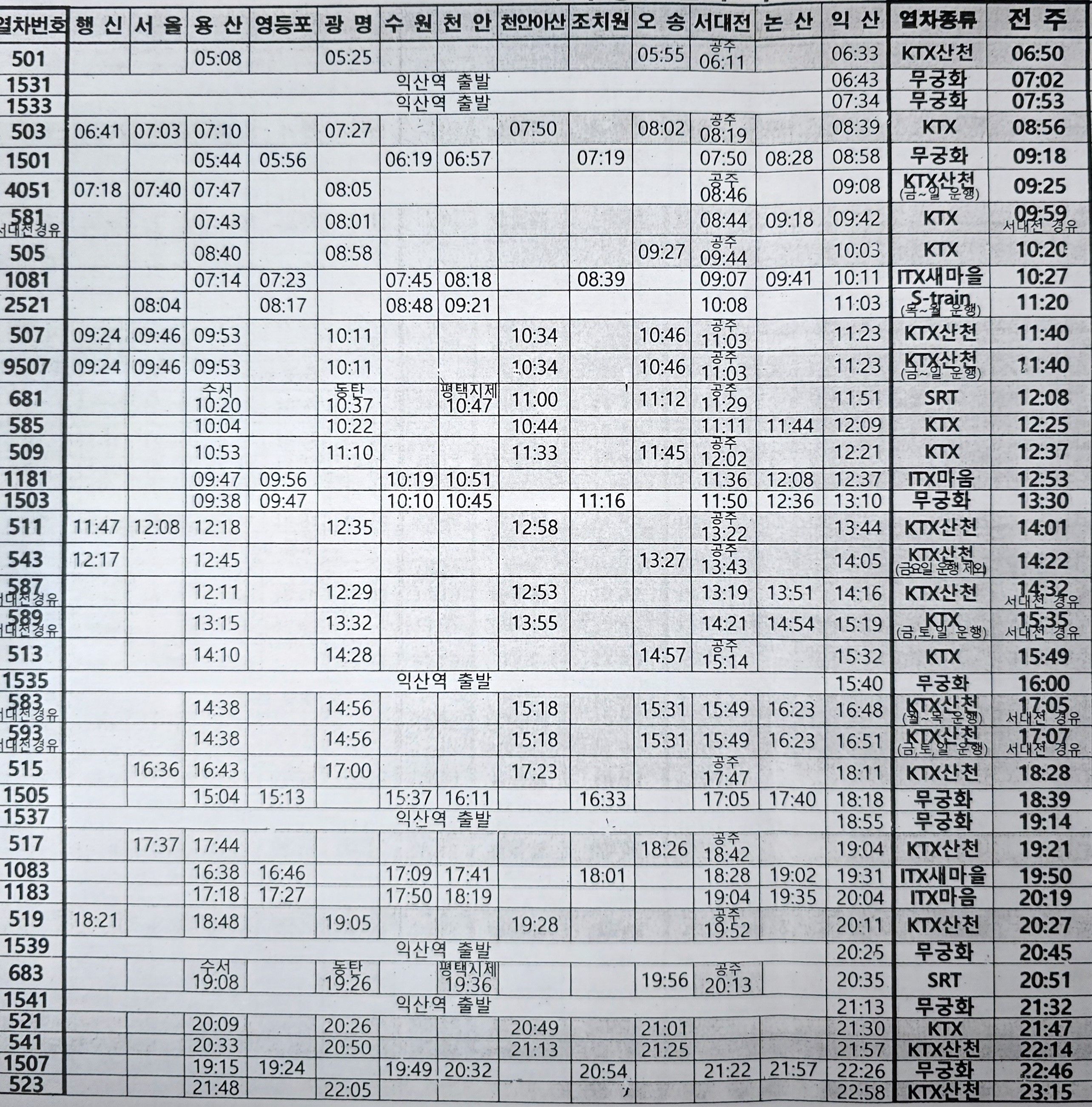 전주역은 고속철도인 KTX, SRT 그리고 일반열차인 ITX 새마을,ITX 마음,무궁화호 열차가 정차하는 기차역으로,기차 시간표는 2024년 11월 최종변경된 이후 2025년 2월 23일 현재는 동일한 기차 시간표로 열차가 운행되고 있다.