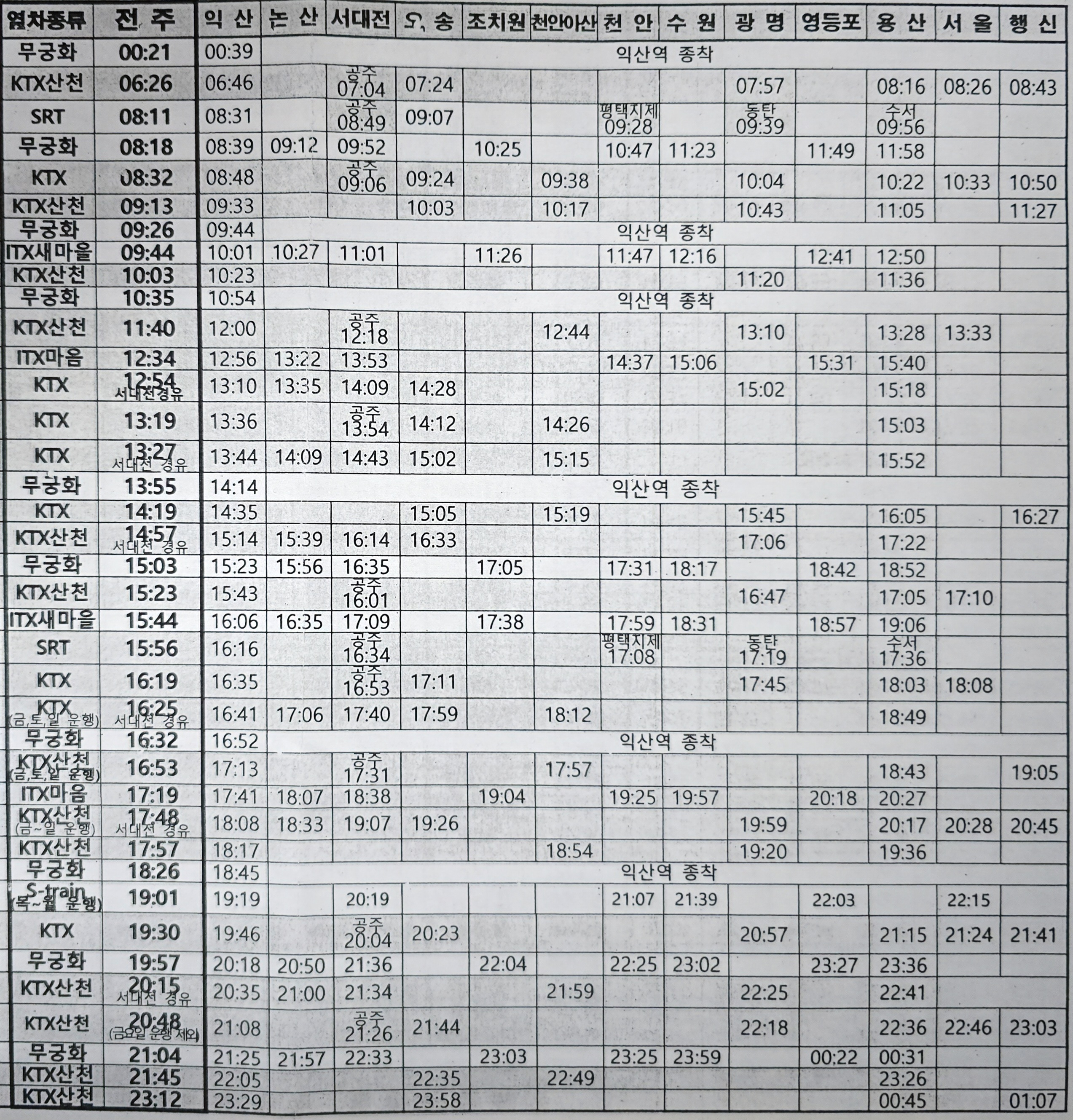 전주역에서 서울가는 상행선 KTX 시간표(전주역→용산역,서울역,행신역)