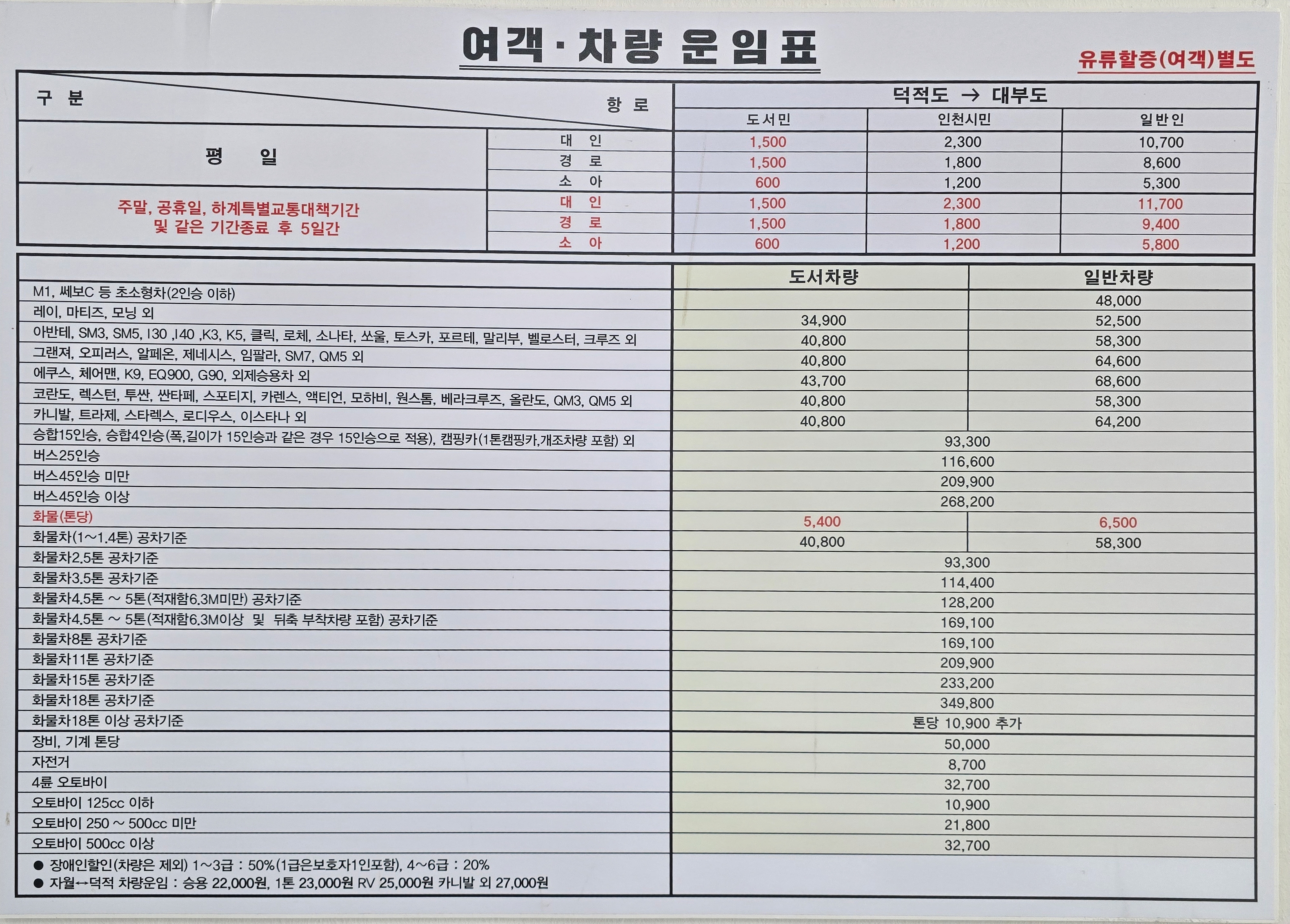 그리고 대부도에서 소야도(덕적도)가는 배 요금은 유류할증료 포함 11,100원이다.