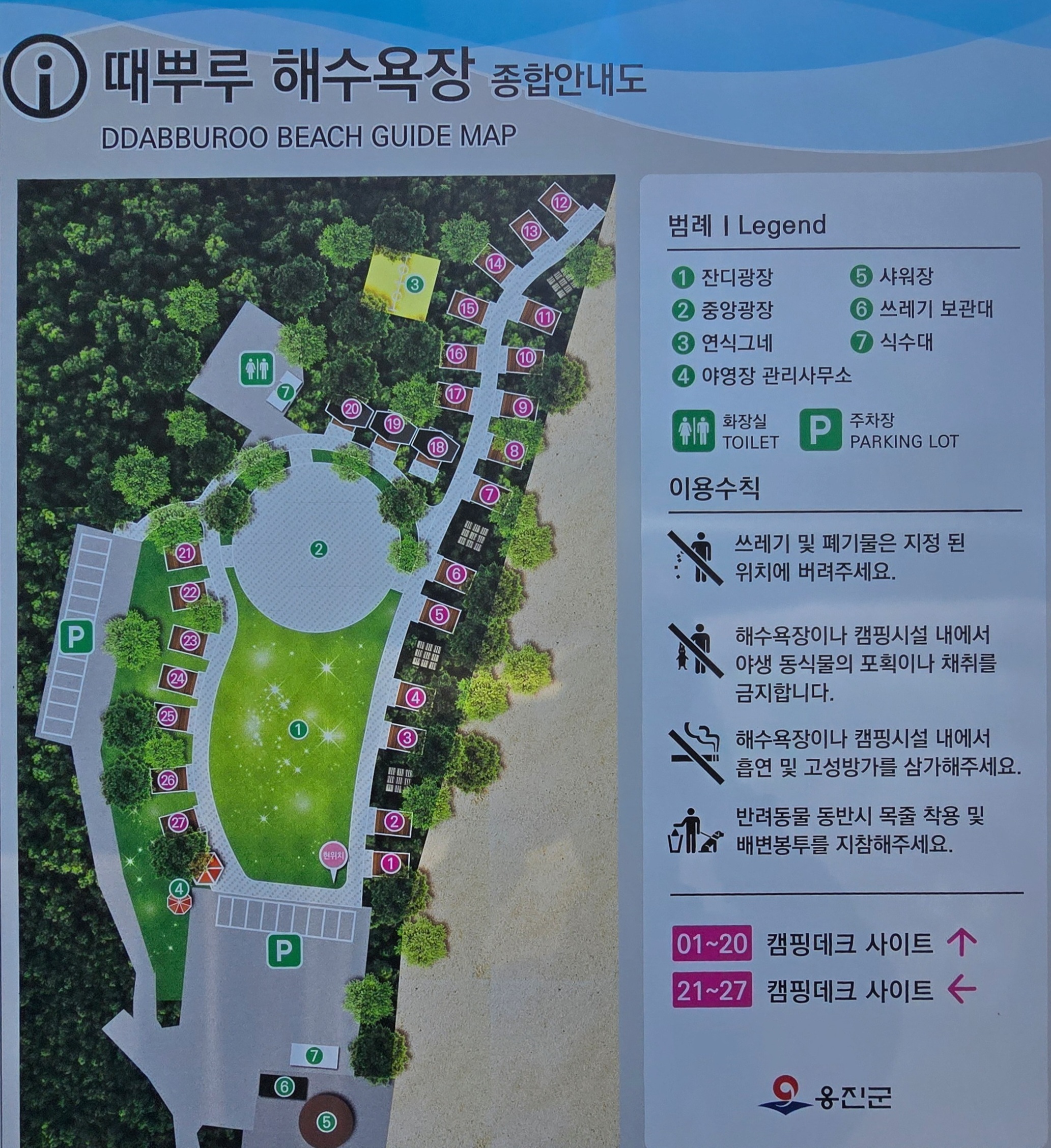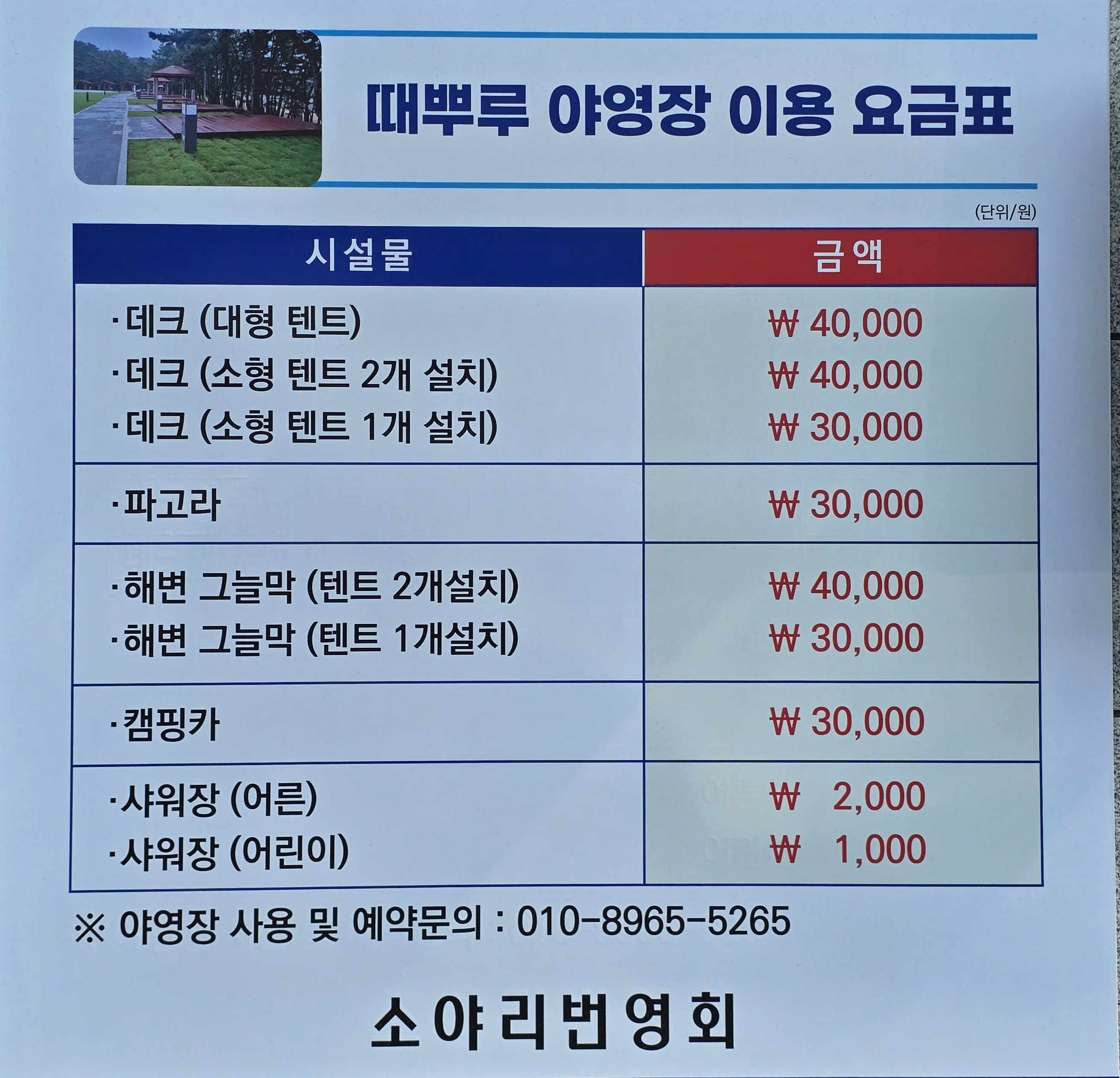 그리고 떼뿌루 해수욕장 해변에 그늘막(텐트 2개설치)을 설치하고 야영을 할경우에는 40,00원이고,해변에 텐트1개를 설치할 경우에는 30,000원이다.