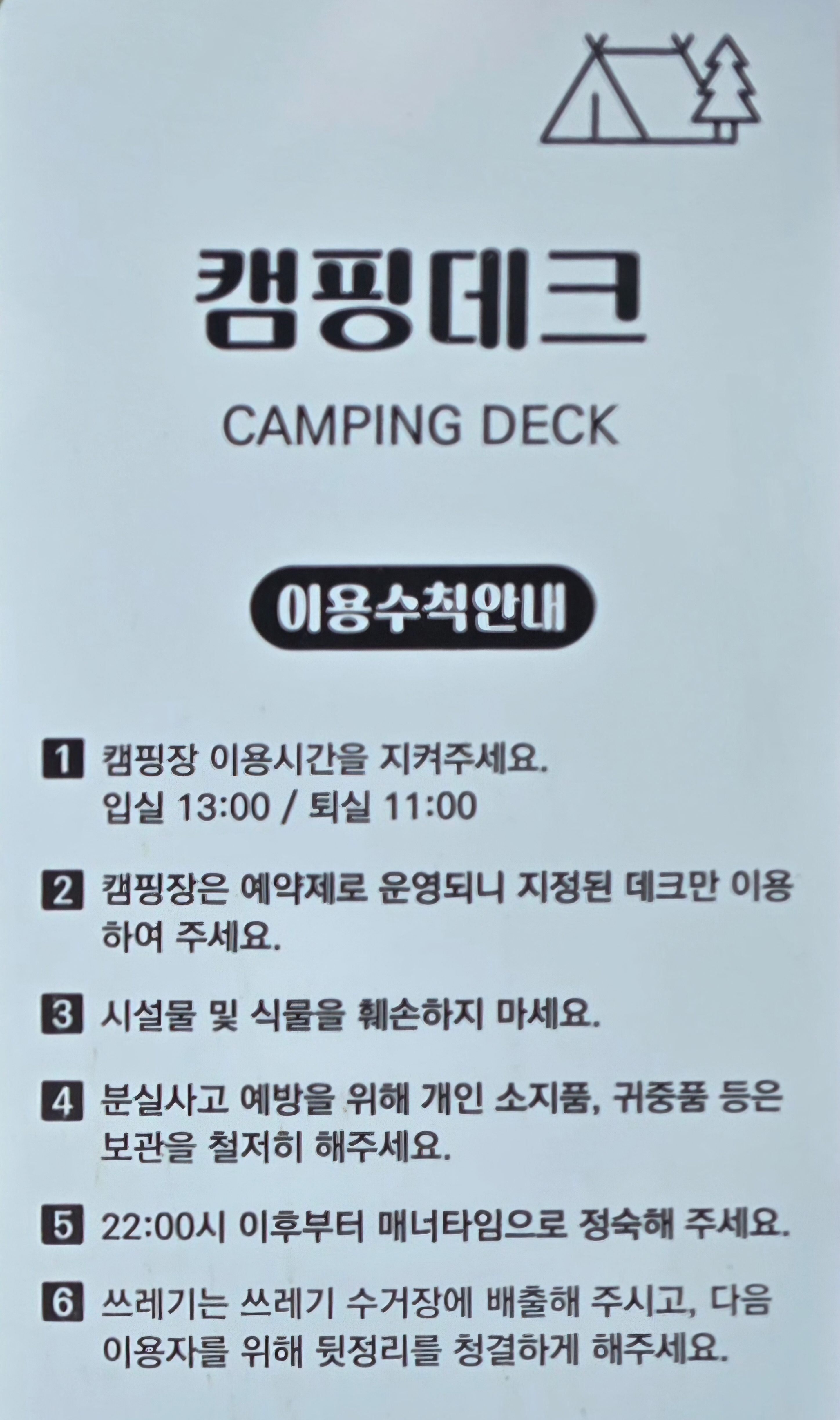 떼뿌루 캠핑장 입실은 13시이고 퇴실은 11시이다.