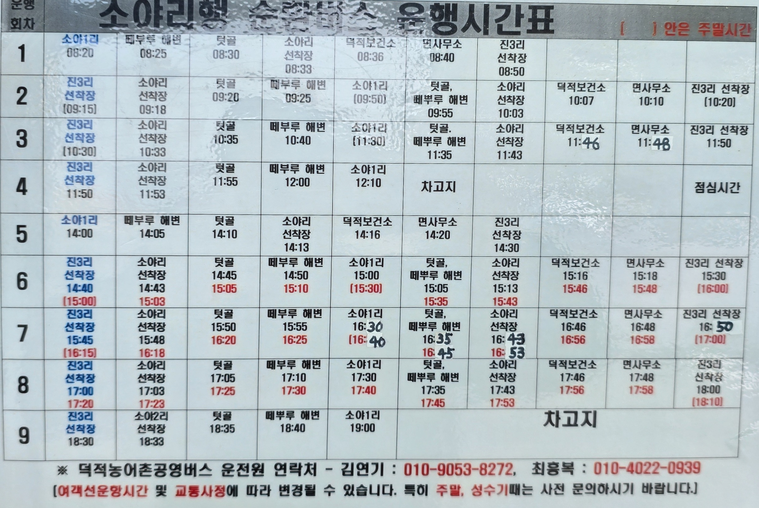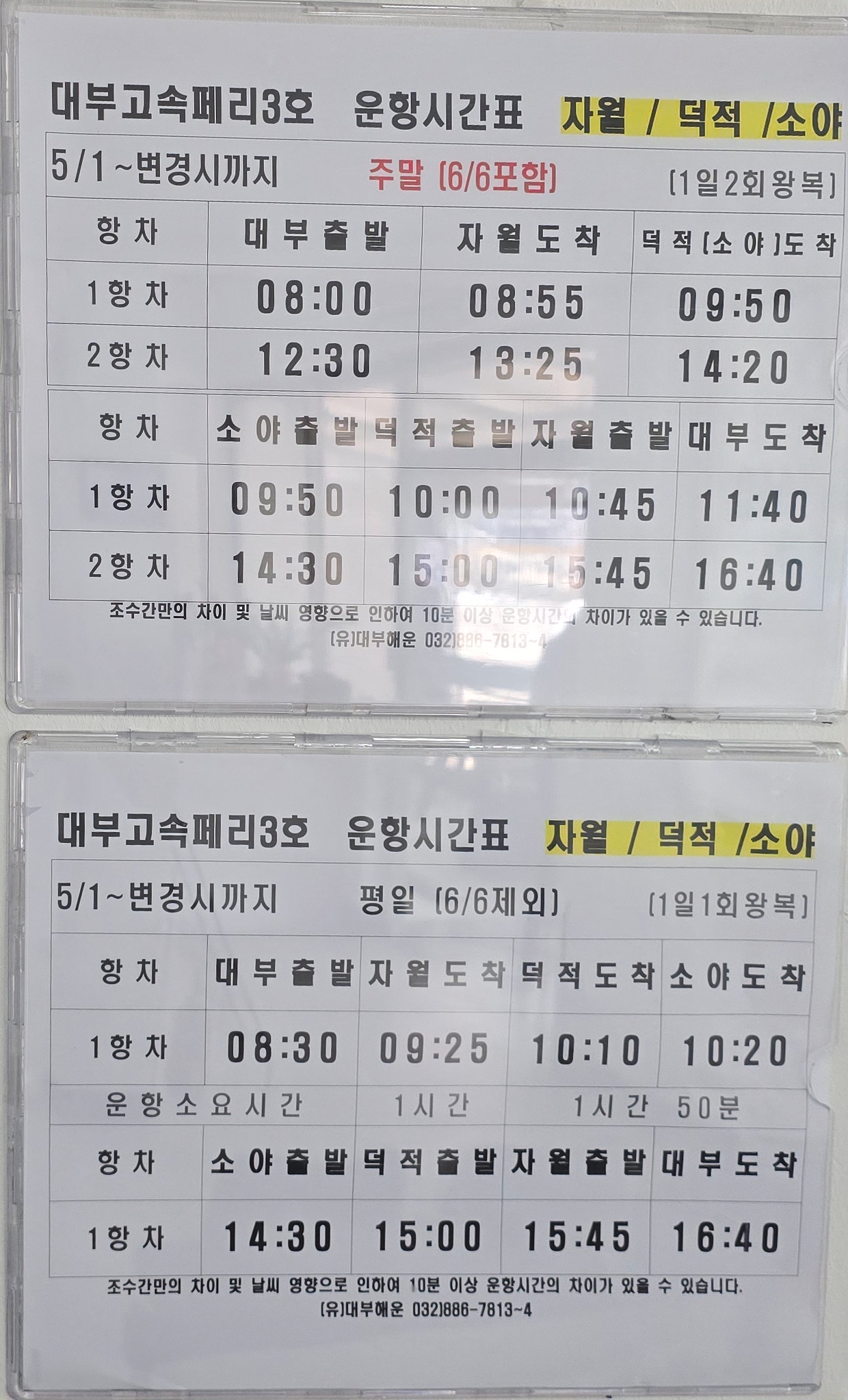 대부도에서 소야도 가는 배는 08시30분에 대부고속페리3호 차도선이 운항한다.