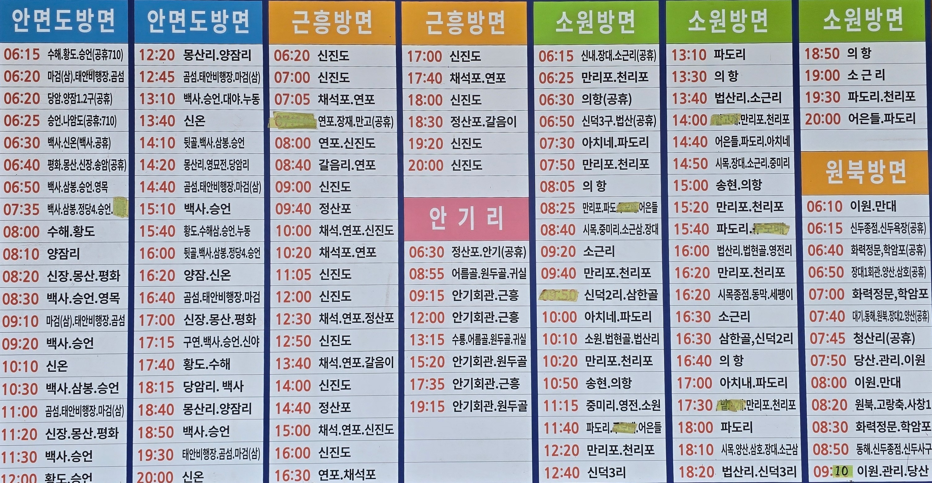 태안에서 안면도가는 버스는 직행 시외버스와 좌석버스가 운행되고 있는데 직생시간은 도로정체시 시간이 지연되거나 빠질 수 있으니 좌석버스 시간을 참고하는 것이 좋다.