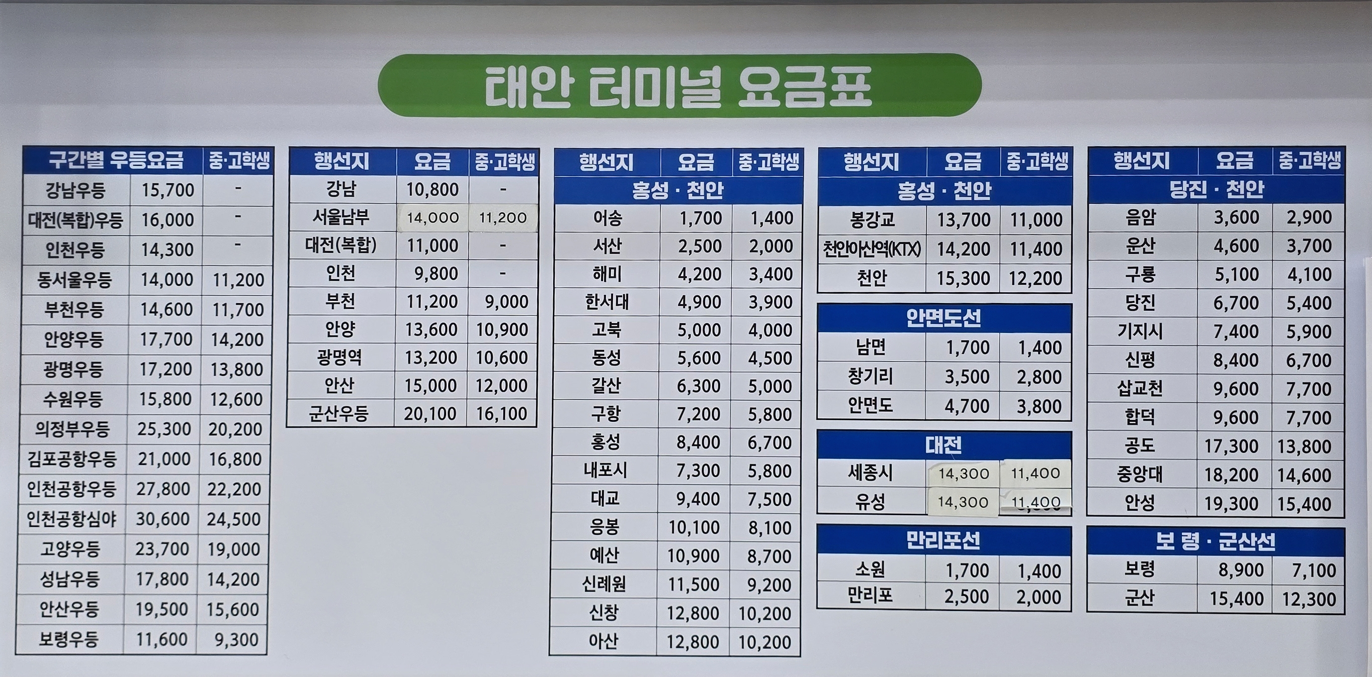 태안터미널에서 당진가는 버스요금은 6,700원,천안은 15,300원,부천은 우등버스요금이 14,600원이다.