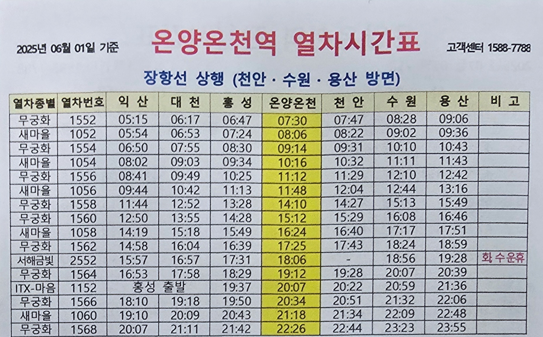 온양온천역의 기차 시간표는 2025년 6월 1일 시간표가 최종적으로 변경되었고 현재는 동일한 시간표로 기차가 운행하고 있다