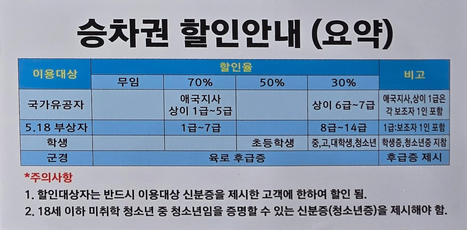 국가유공자는 최대 70% 요금 할인 적용을 받게되고,애국지사,상이1급은 각 보조자 1인포함해서 할인 적용된다.