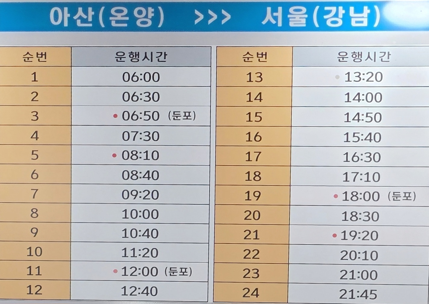 아산고속버스터미널에서 아산둔포를 경유하는 고속버스는 06시50분,12시,18시에 운행한다.