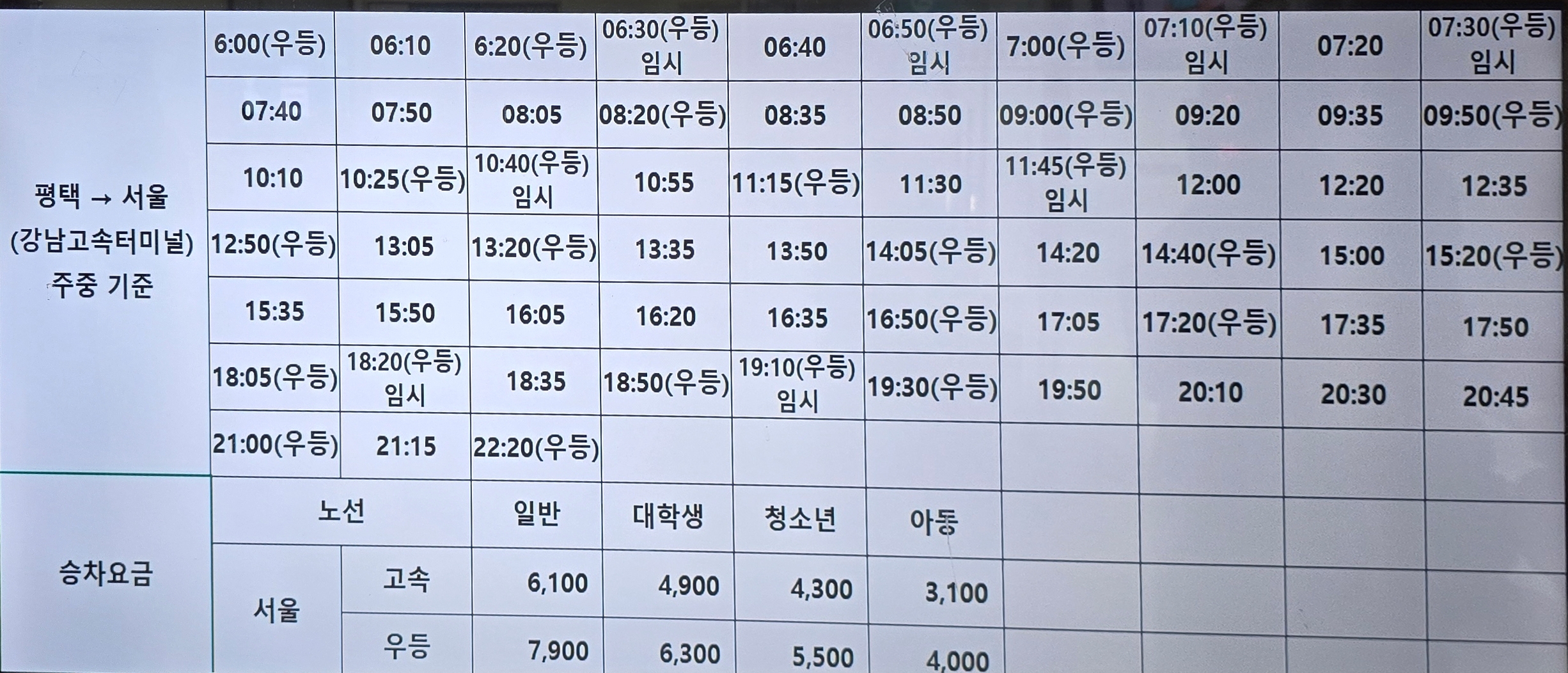 평택에서 서울고속버스터미널까지 첫차는 06시에 우등고속버스가 운행되고 요금은 7,900원이고,막차는 20시45분에 운행한다.