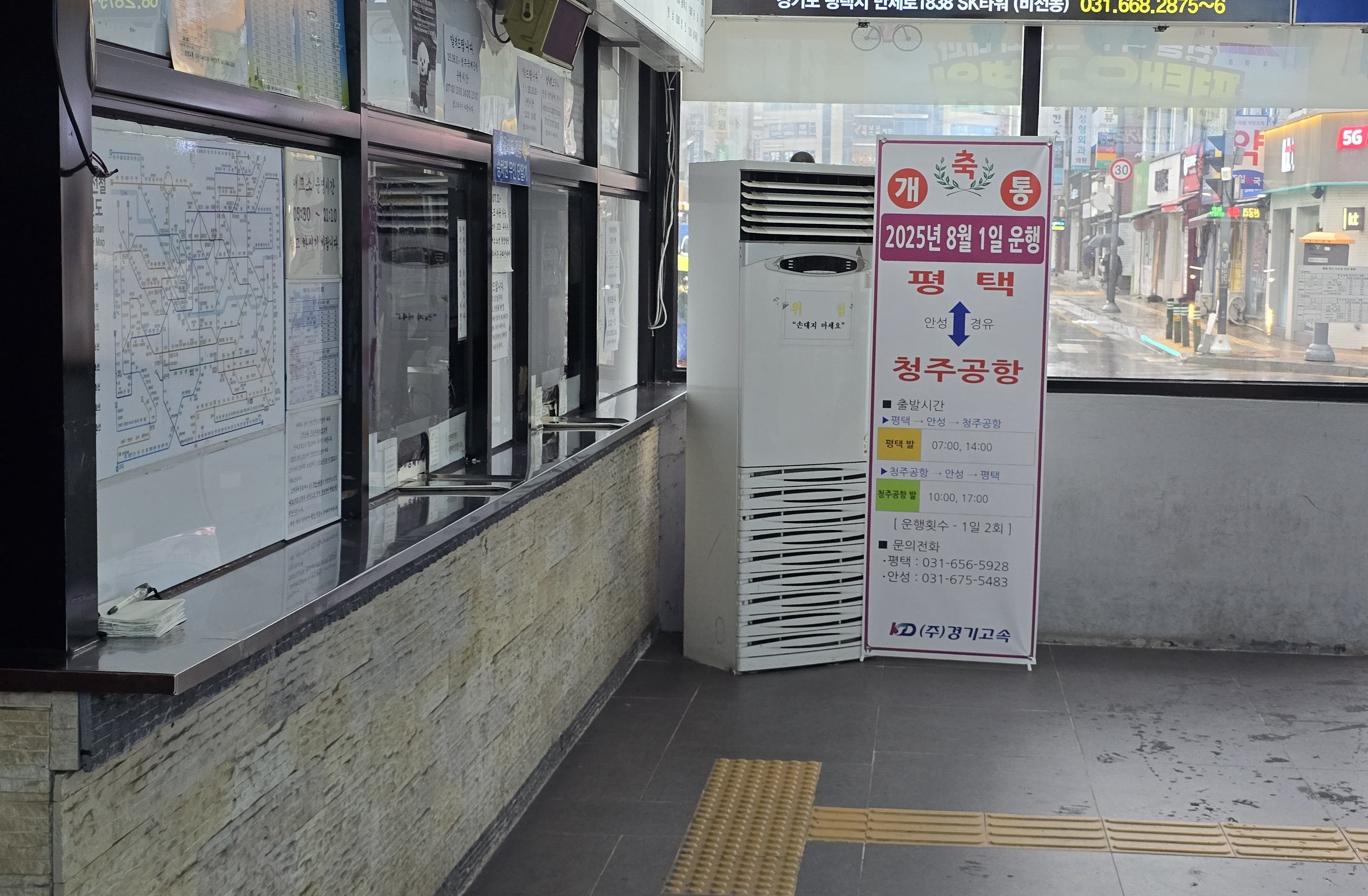 평택시외에서 청주공항가는 버스는 하루에 4회 07시,13시,14시,15시에 평택을 출발하여 평택대,공도,안성을 경유하여 청주공항까지는 약 2시간이 소요되고 요금은 11,900원이다.