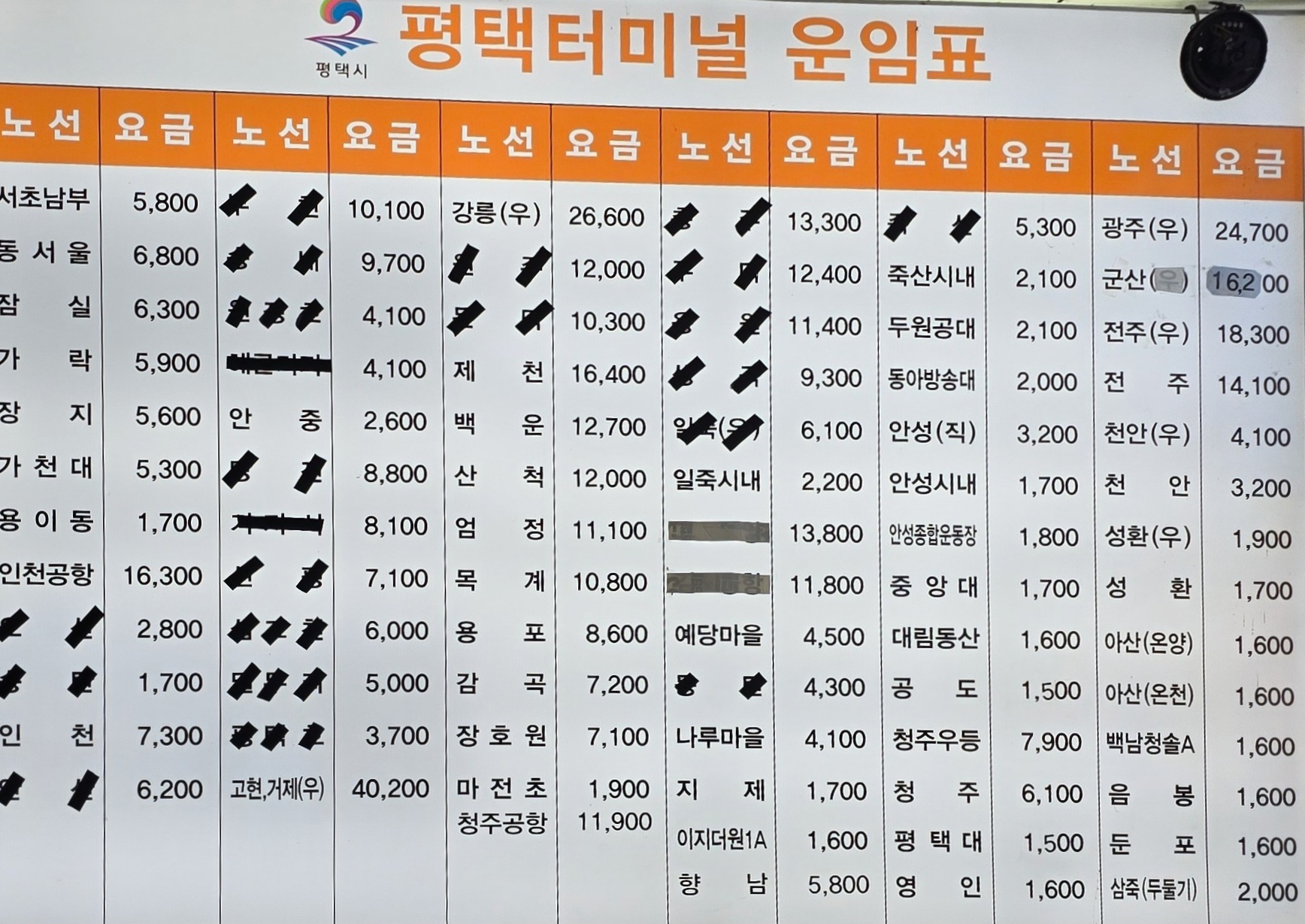 평택시외버스터미널 버스 운임표