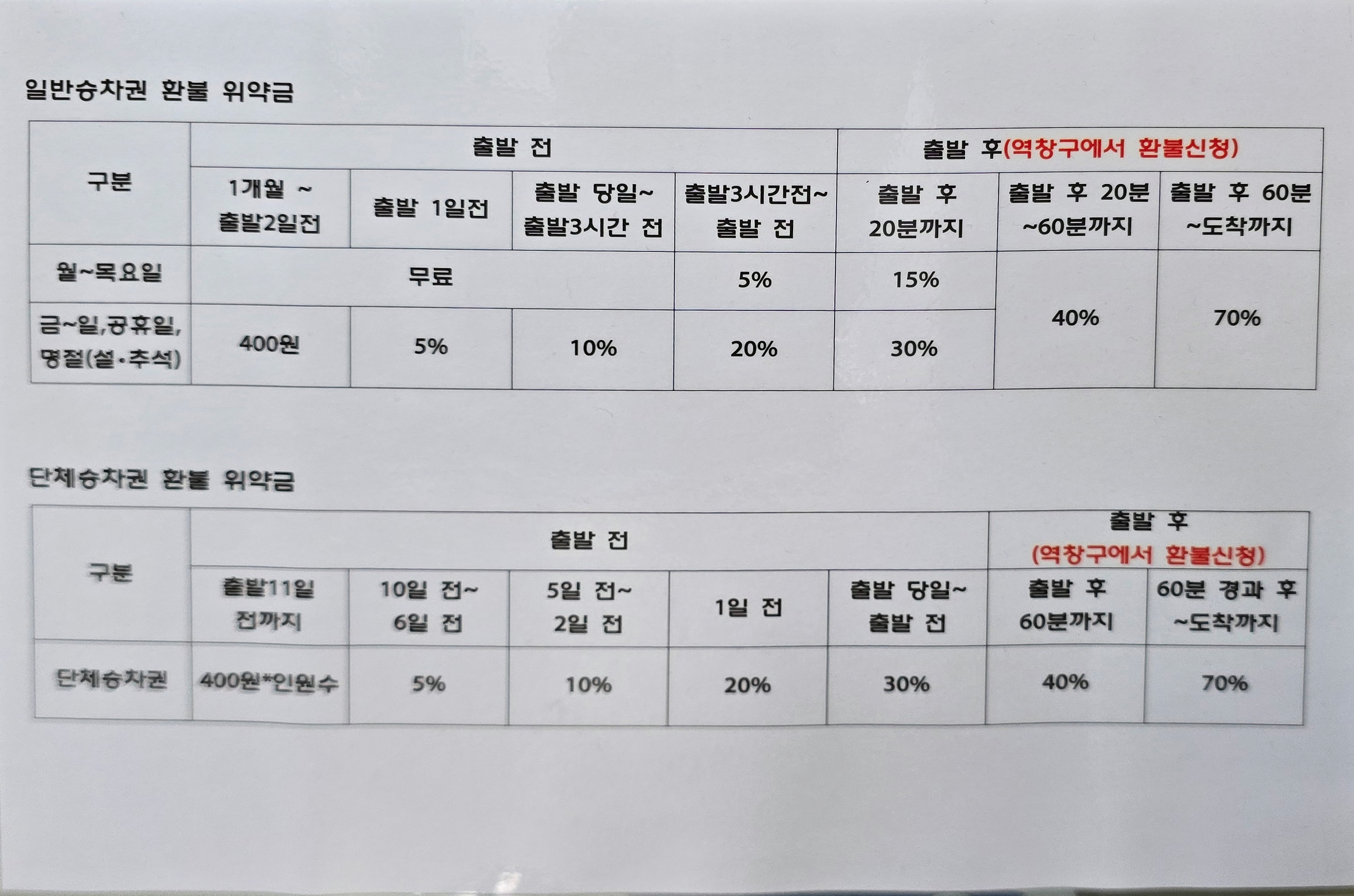 승차권을 구매후 환불 할 경우에는 환불하는 시점에 따라 위약금이 다르게 적용된다.