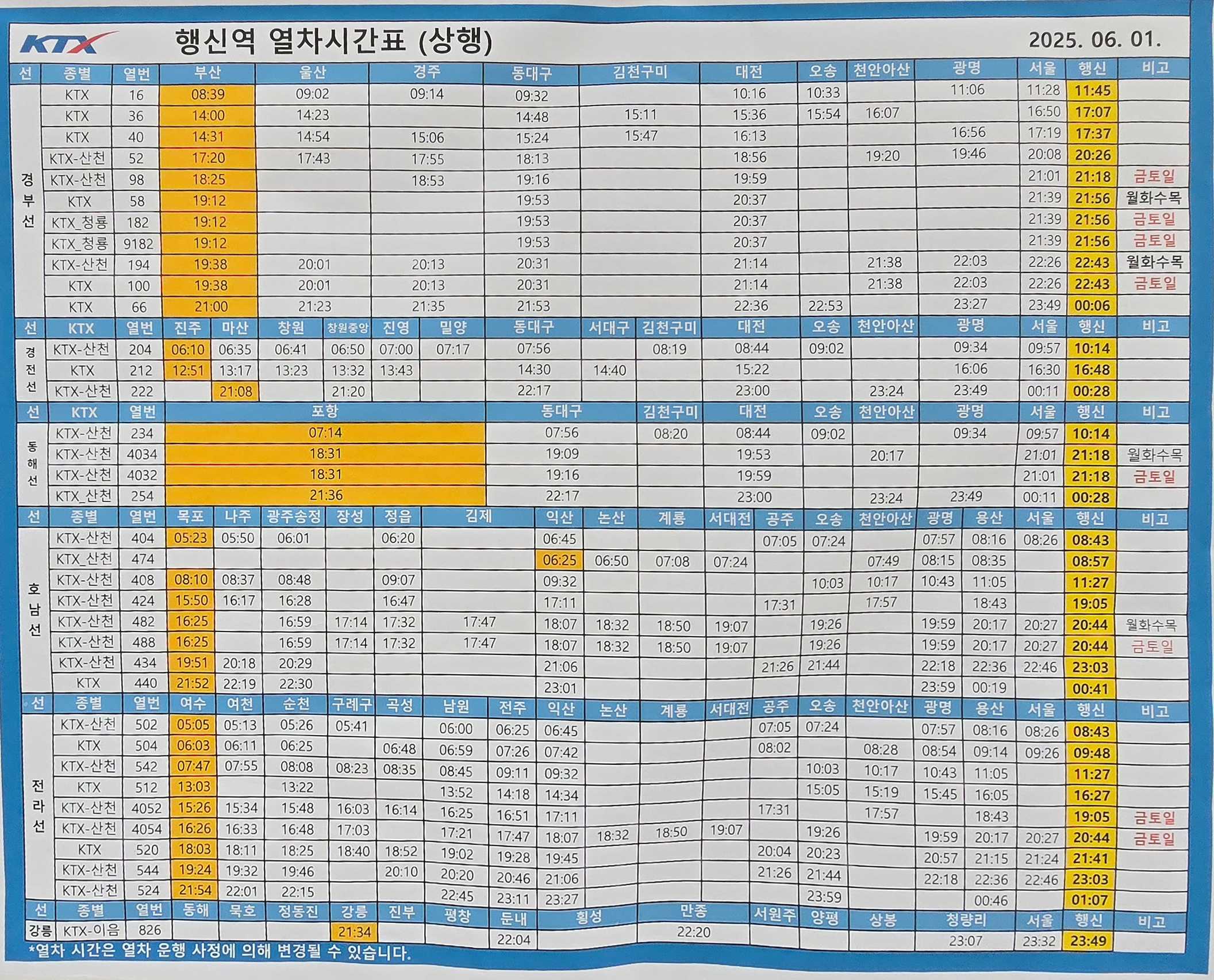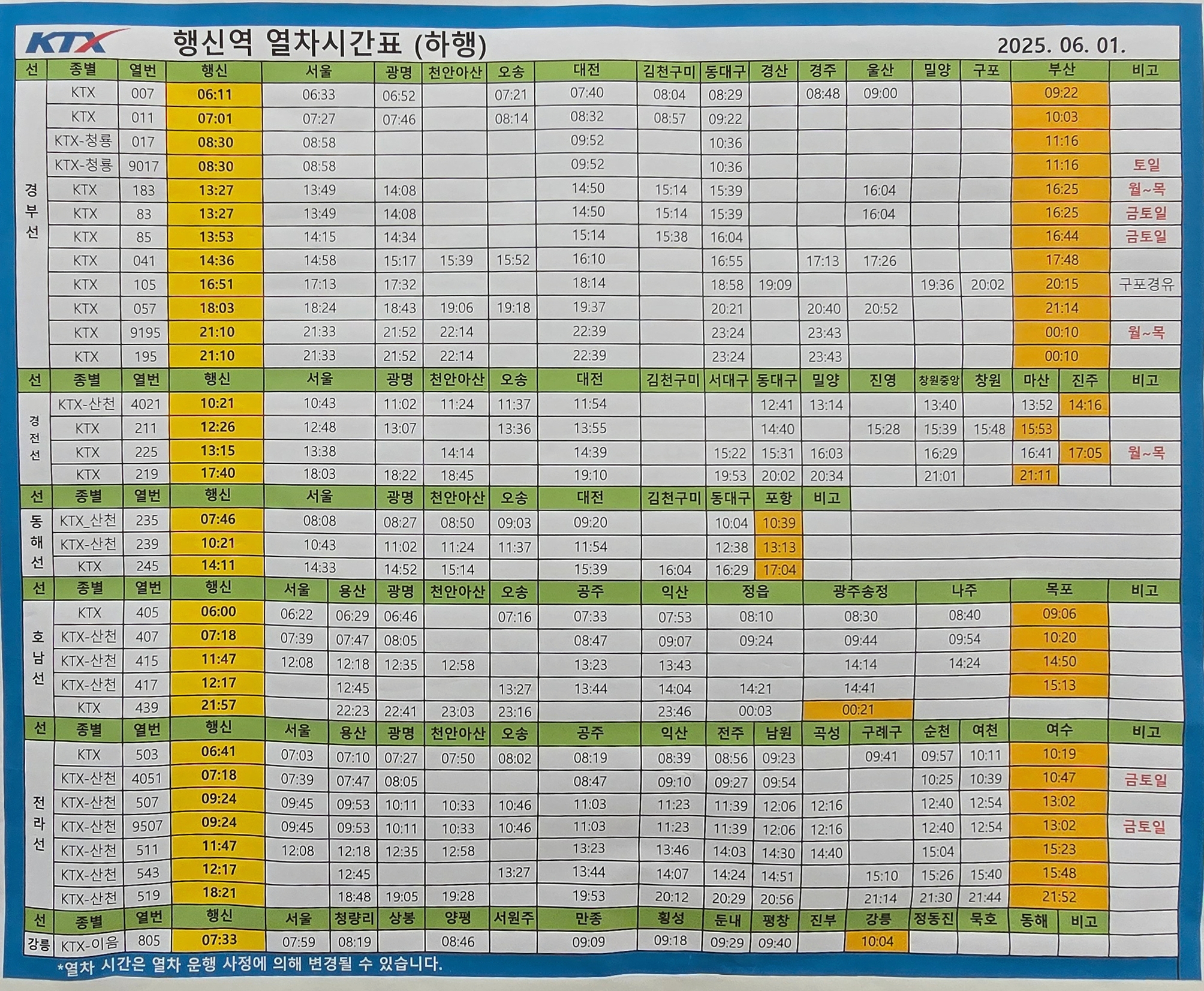 행신역 KTX 기차 시간표는 2025년 6월 1일 최종 시간표가 변경되었고,2025년 10월 17일 현재는 동일한 시간표로 KTX 열차가 운행되고 있다.