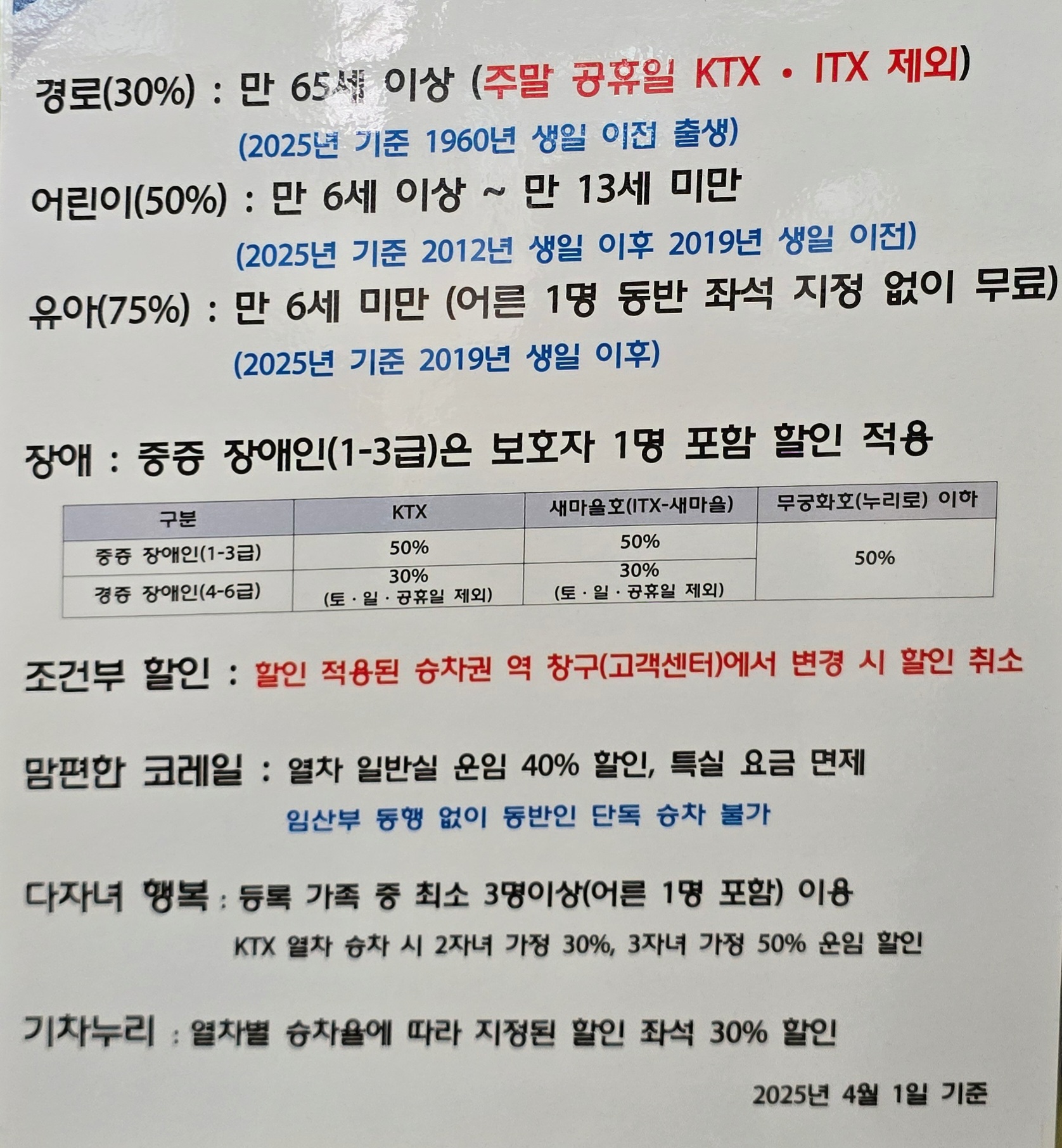 만 65세 이상 경로는 30% 요금 할인 적용 대상이 되지만 주말이니 공휴일에 KTX나 ITX 새마을호 열차를 이용할 경우에는 할인 적용을 받을 수 없다.