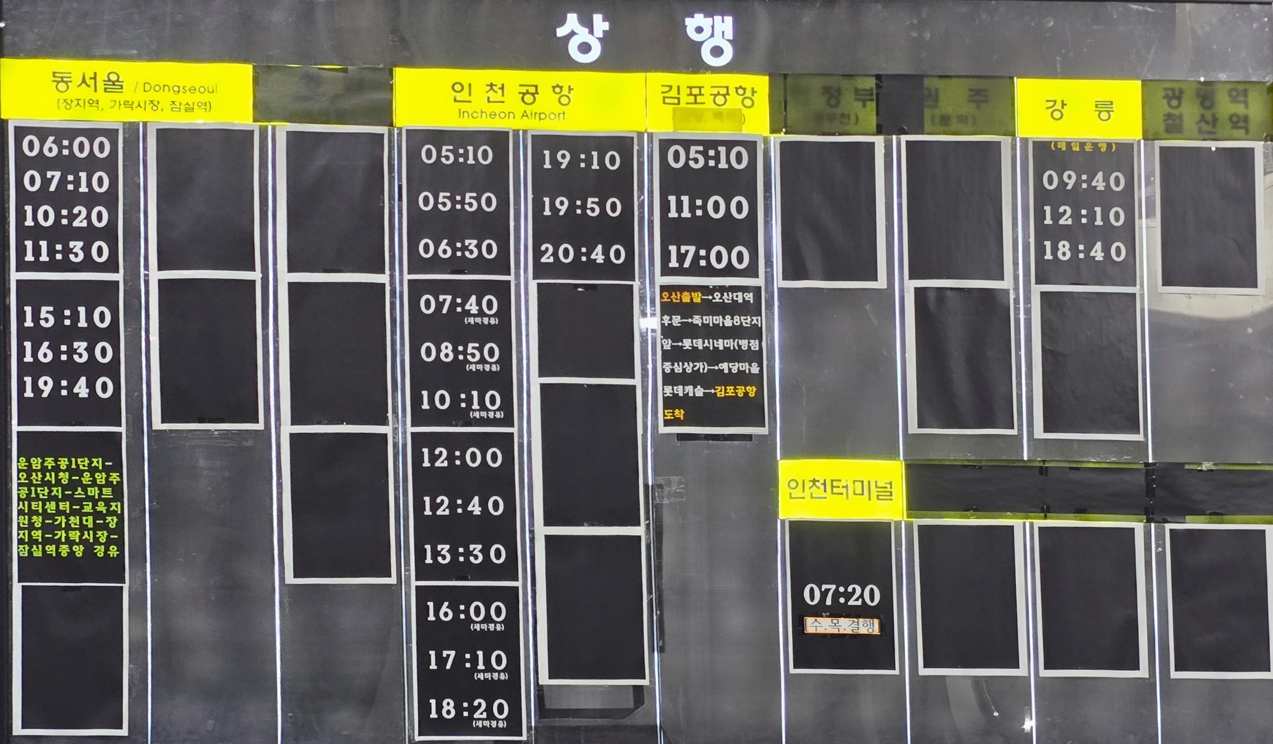 오산터미널에서 김포공항가는 시외버스는 2025년 10월 20일 현재는 하루에 3회 05시10분,11시,17시에 운행한다.