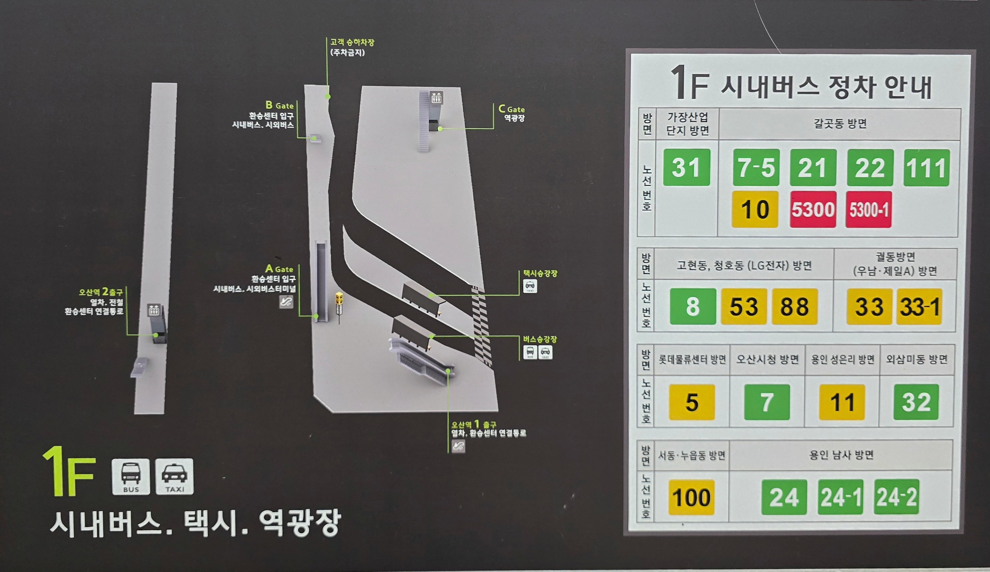 오산터미널은 오산역 철도 대합실 출구 바로 앞에 위치하고 있어 수도권 1호선 전철,기차 환승이 편리한 버스 버스 터미널이다.
