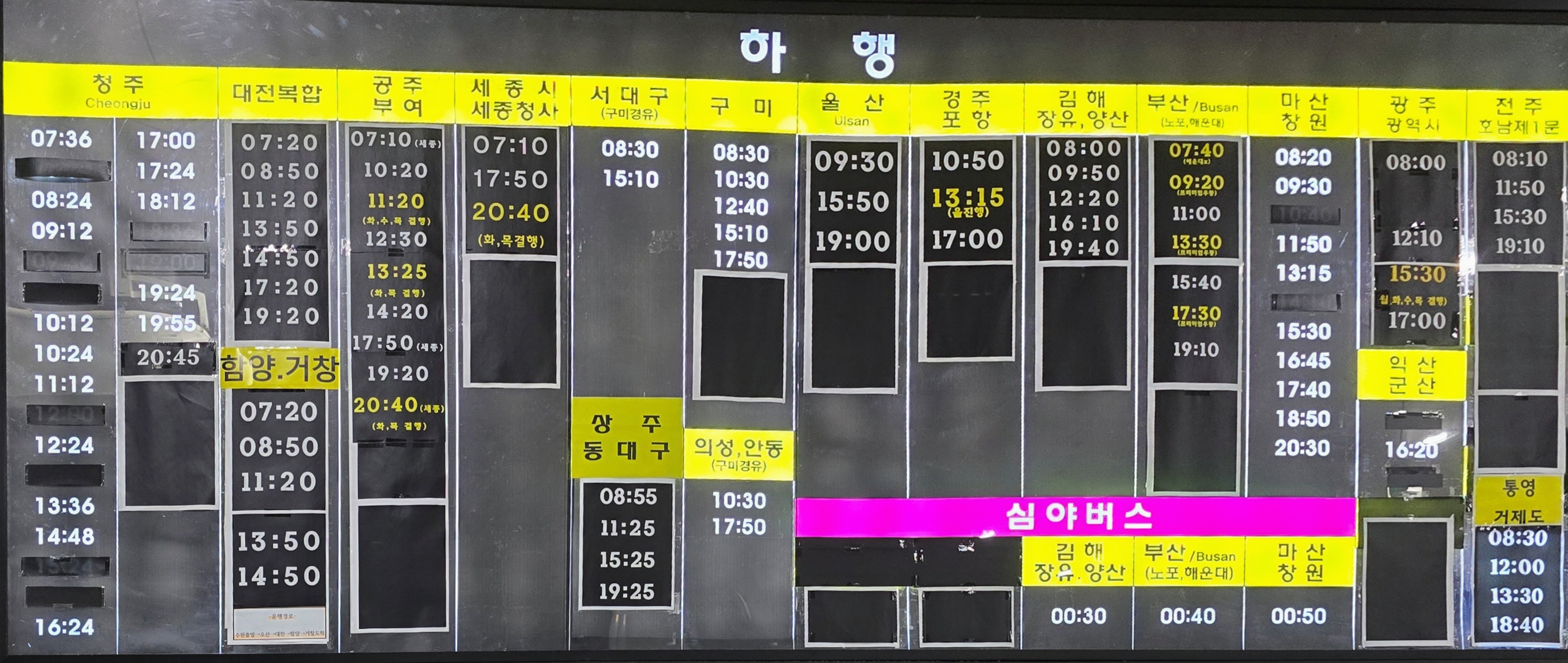 오산터미널에서 김해가는 심야버스는 00시30분,부산은 00시40분,마산/창원은 00시50분에 심야버스가 운행한다.