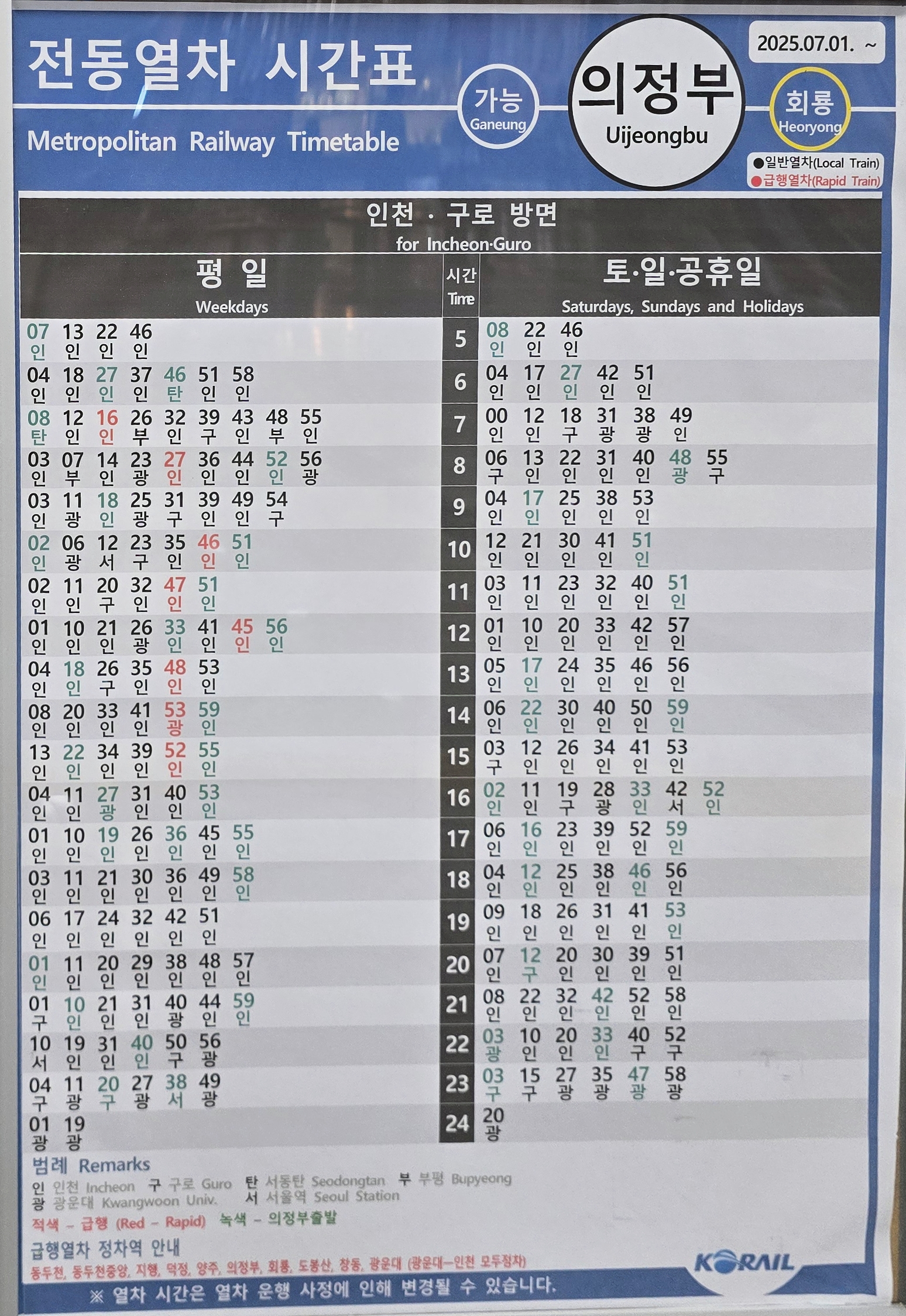 의정부역에서 인천,구로가는 전철 시간표는 2025년 7월 1일 최종변경되었고,2025년 10월 23일 현재는 동일한 시간표로 전철이 운행되고 있다.