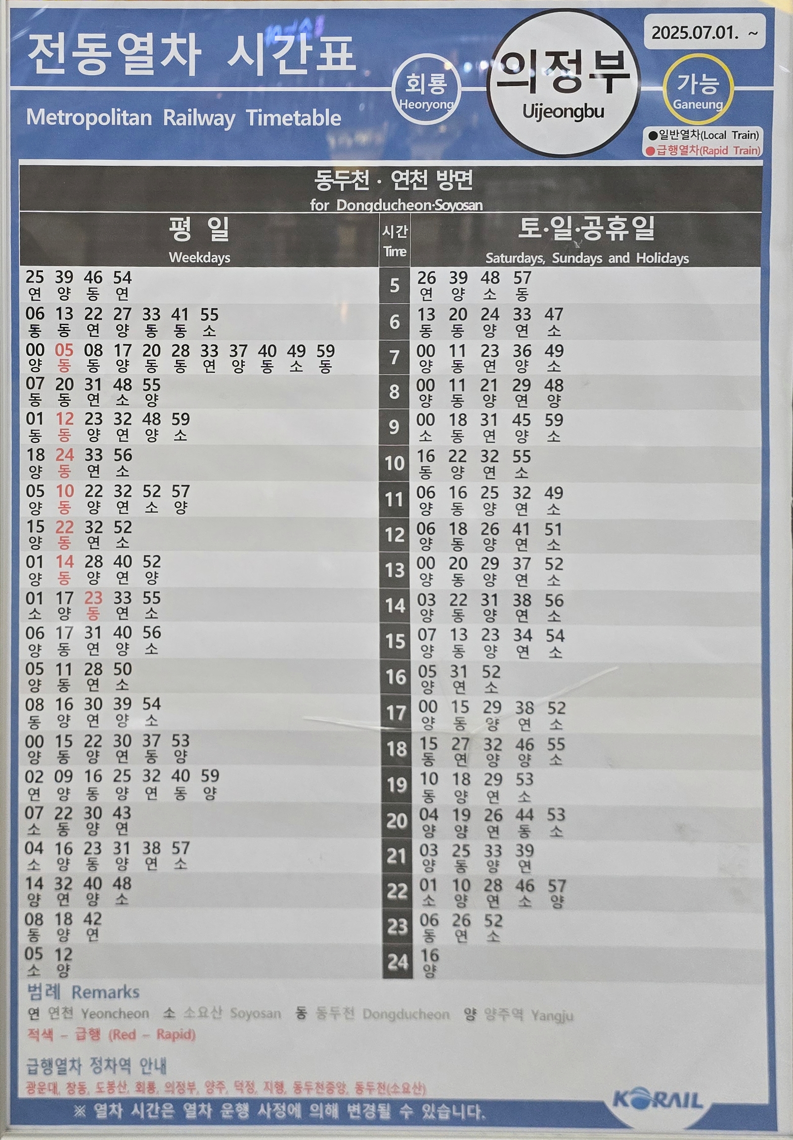 그리고 의정부역에서 동두천역가는 급행 전철은 평일에만 운행되는데 07시05분,09시12분,10시24분,11시10분,12시22분,13시14분,14시23분에 의정부역을 출발한다.