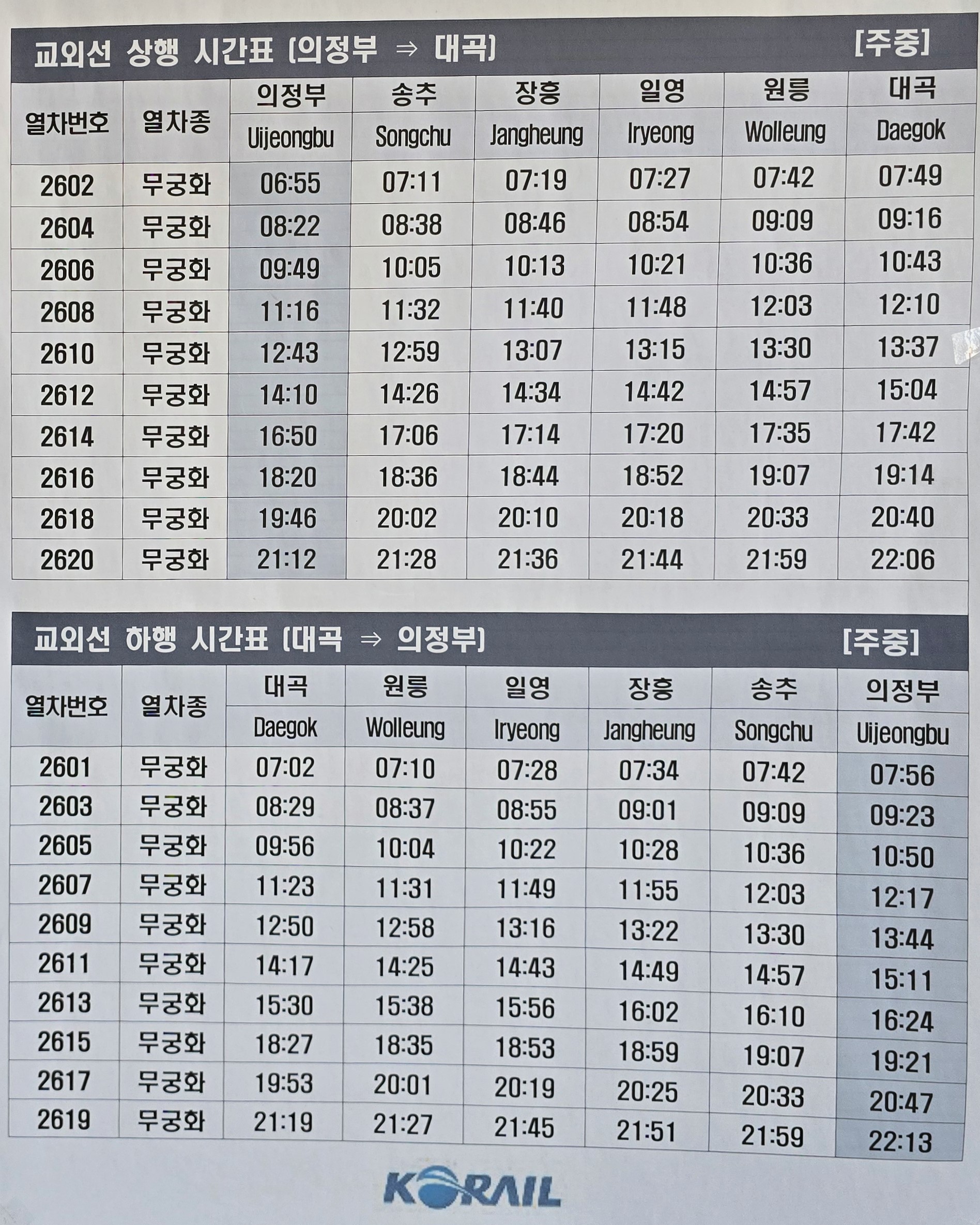 평일 의정부역에서 대곡역가는 교외선 열차는 의정부역을 첫차가 06시55분에 출발하여 송추,장흥,일영,원릉역을 경유하여 대곡역까지는 약 54분이 소요되고 요금은 2,600원이다.
