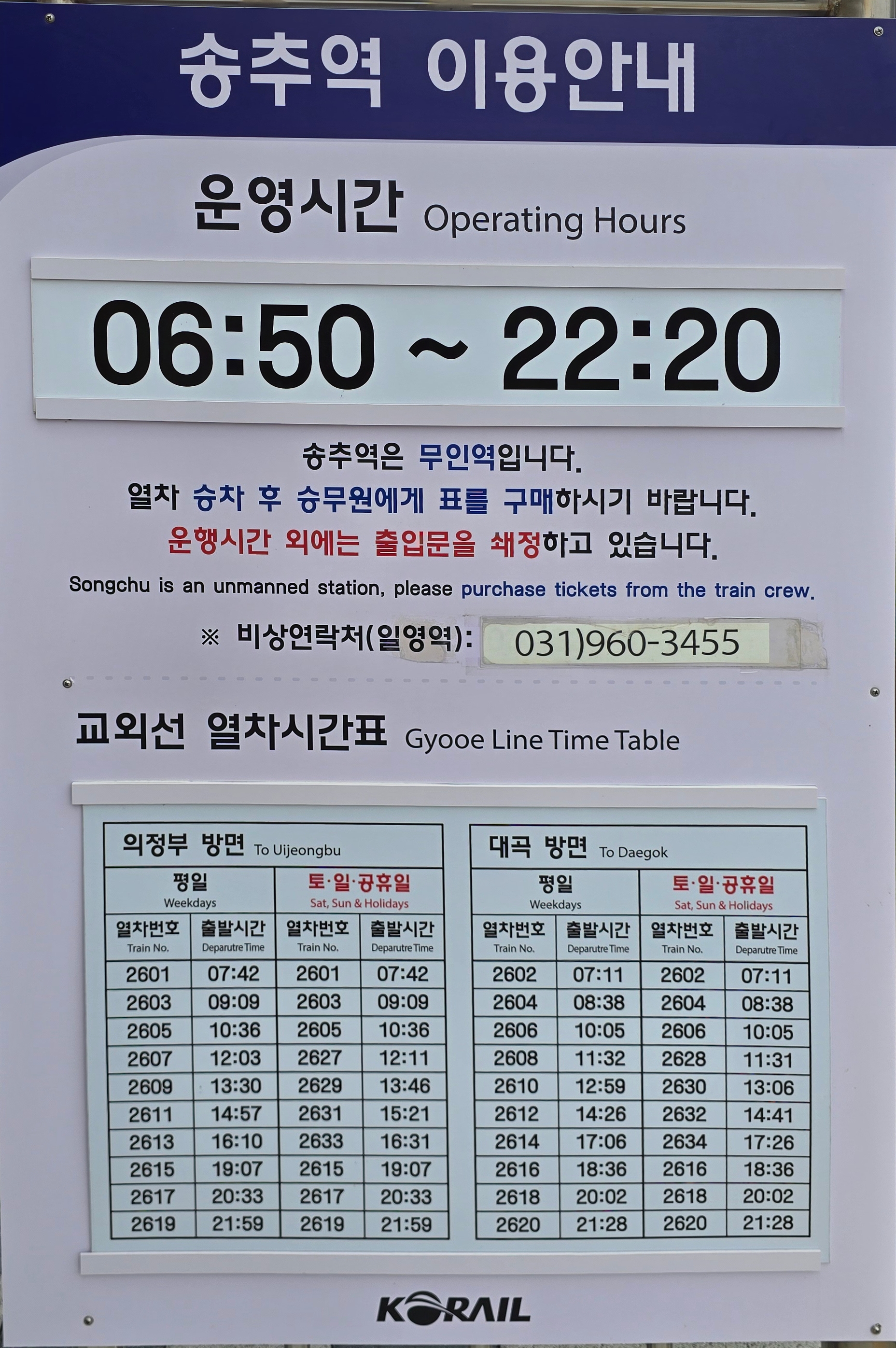 송추역 운영시간은 06시50분~22시20분까지 운영하고 있으며,열차 운행시간 외에는 출입문이 닫혀 있다.