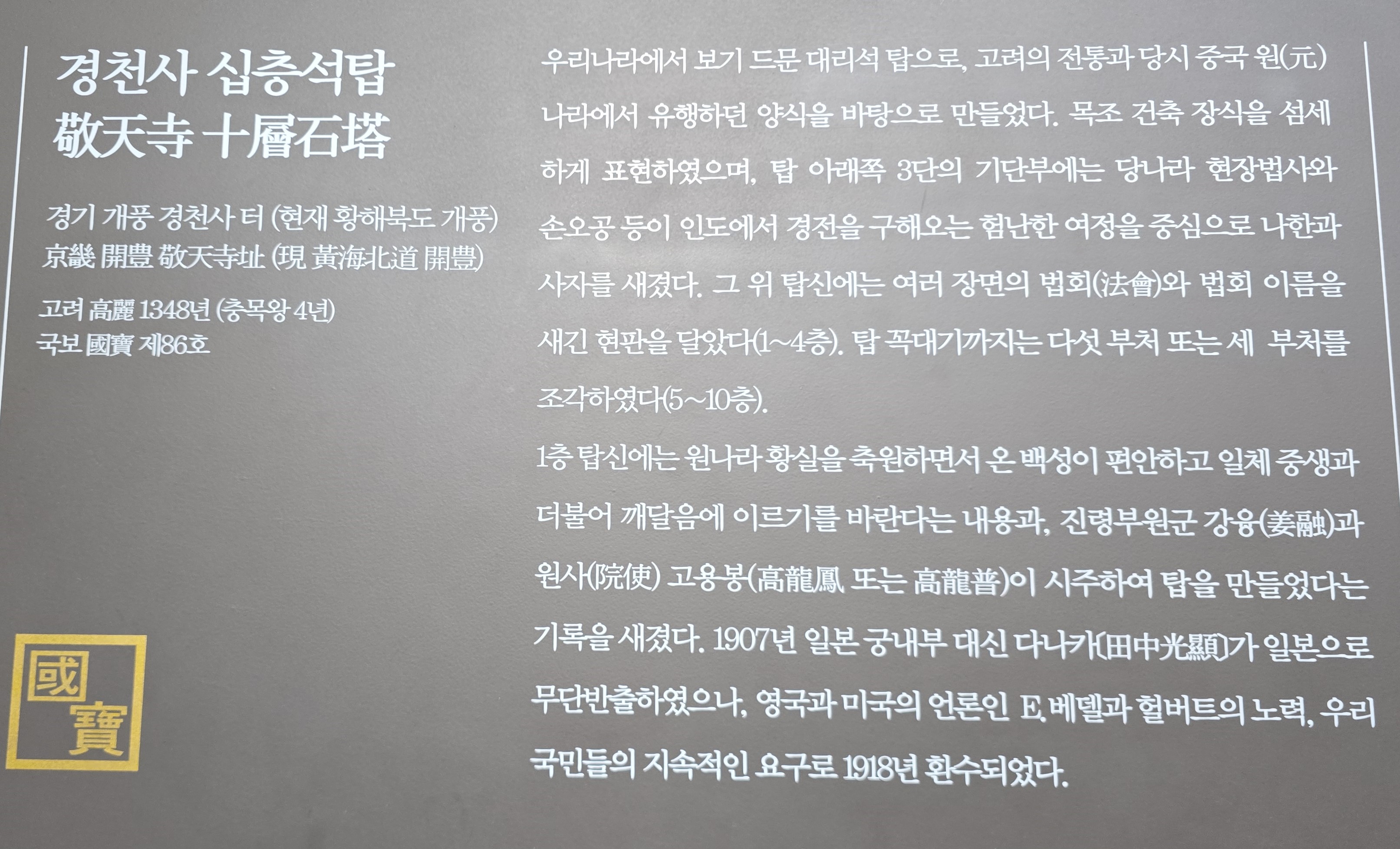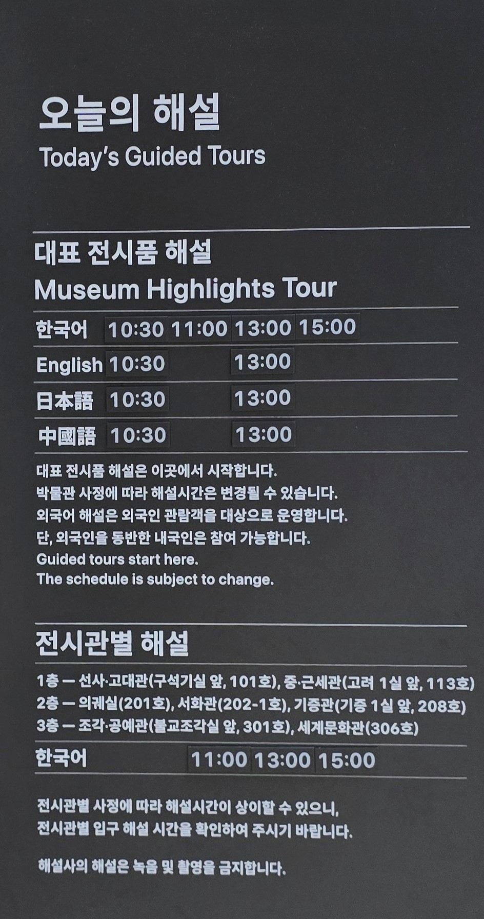 대표 전시품 한국어 해설은 10시30분,11시,13시,15시에 있고,해설 장소는 1층은 구석기실 앞 101호,중근세관은 고려 1실 앞 113호에서 해설을 들을 수 있다.