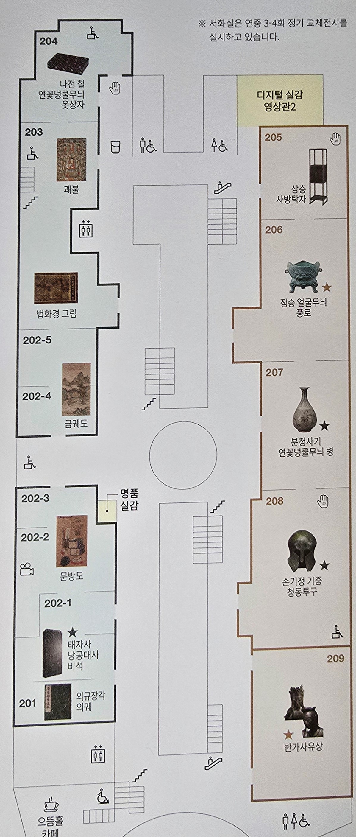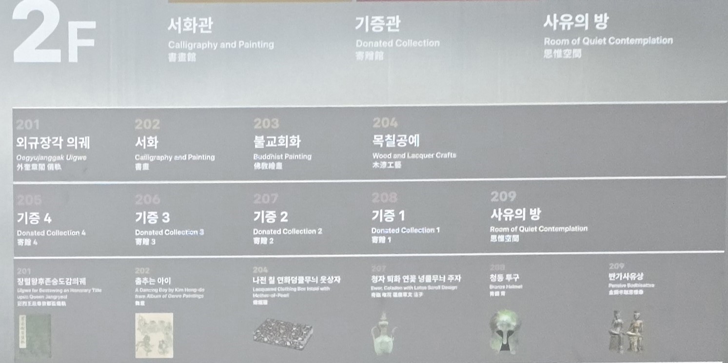 2층은 외규장의 의궤,서화,불교회화,목칠공예 등을 감상할 수 있는 서화관과 기증관,반가사유상이 있는 사유의 방으로 구성되어 있다.
