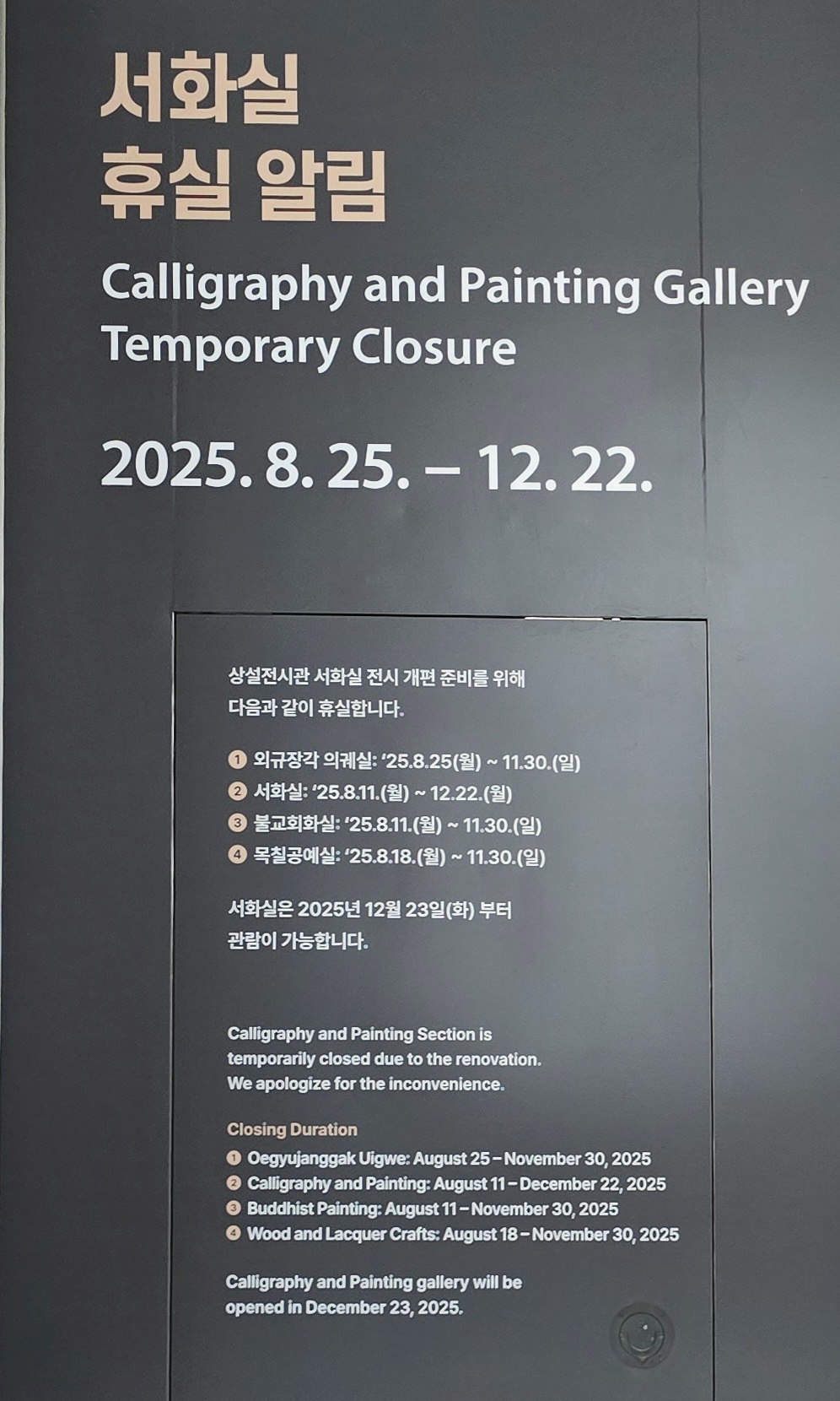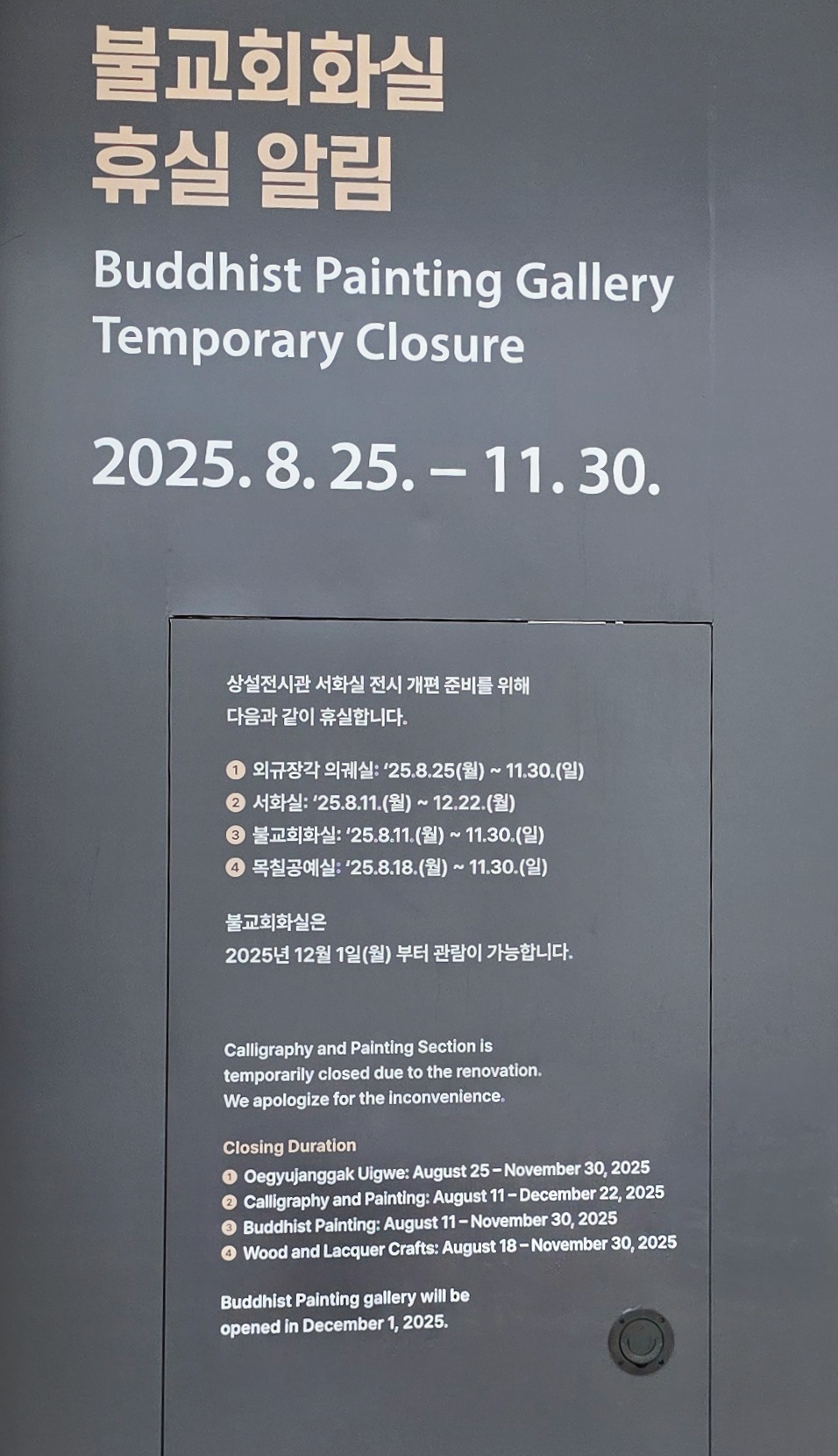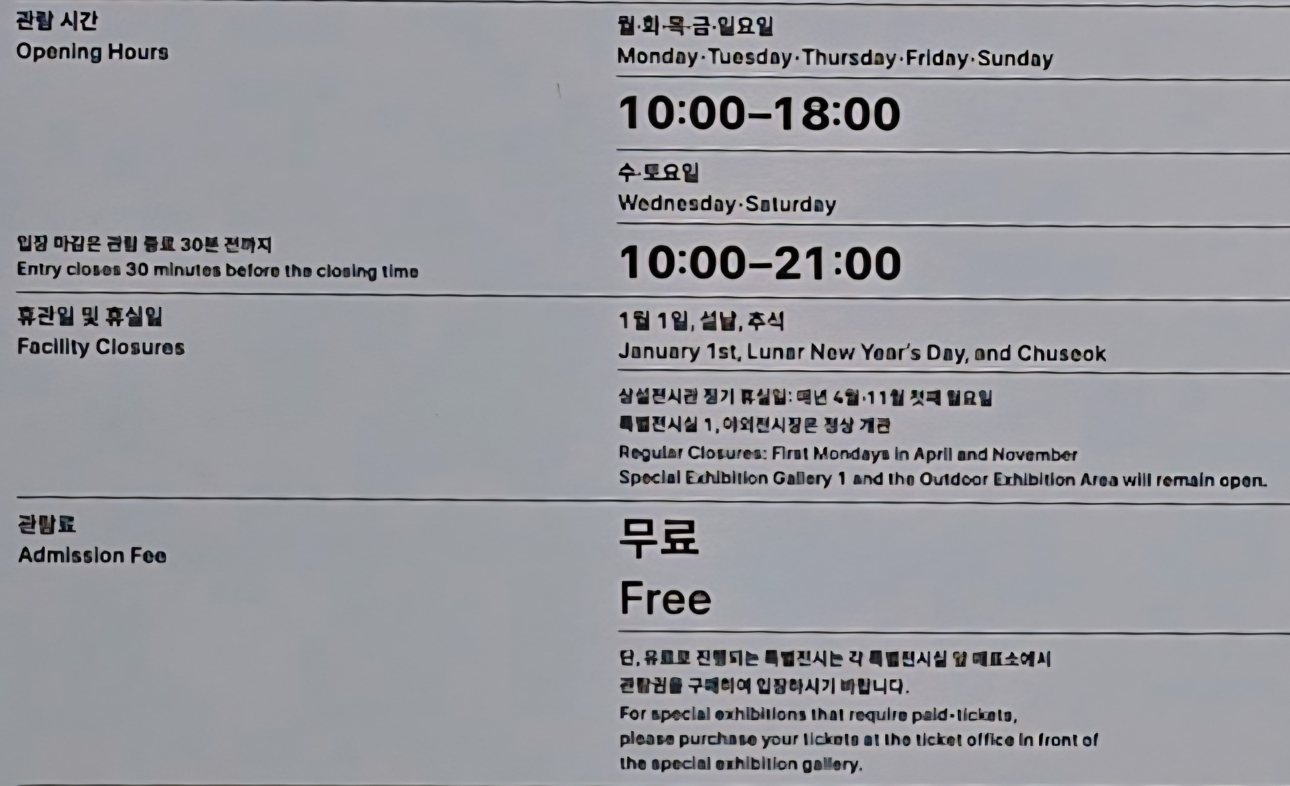 그리고 휴관일은 1월1일,설날,추석,국립중앙박물관장이 지정한 날,그리고 상설전시관 정기 휴실일(매년 4월,11월 첫째 월요일)에 휴관하는데 이는 박물관 사정에 의하여 변경될 수 있다.