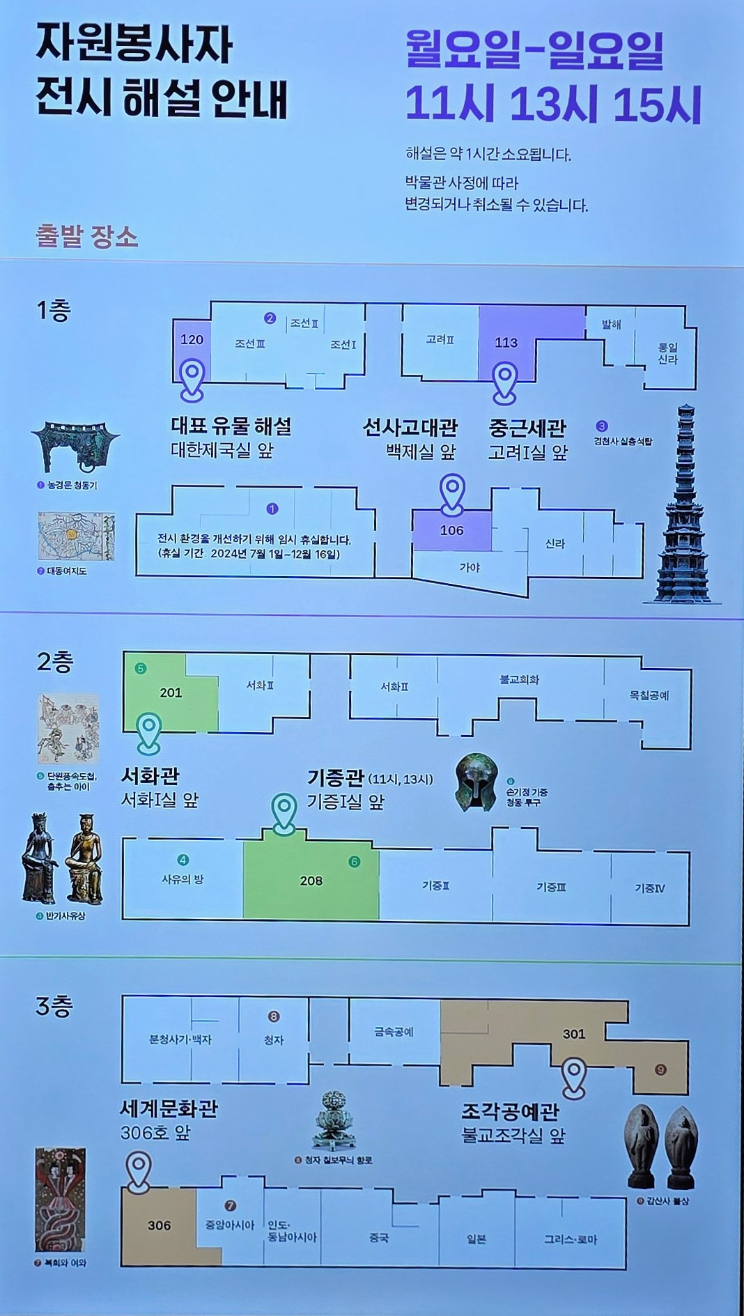상설 전시관 전시물 자원봉사자 해설 안내 시간은 월~목요일 11시,13시,15시에 있고 해설 시간은 약 1시간이지만 박물관 사정에 따라 변경되거나 취소 될 수 있다.