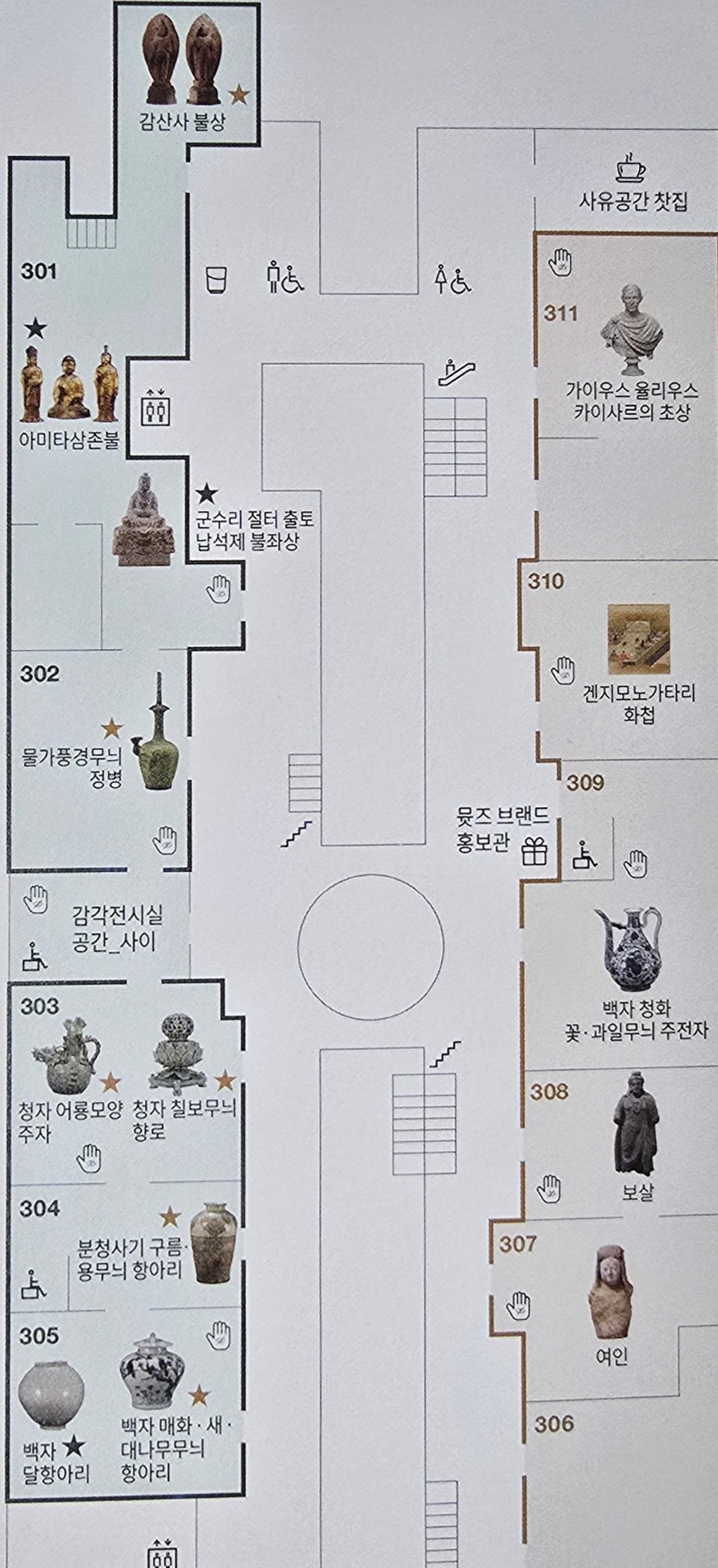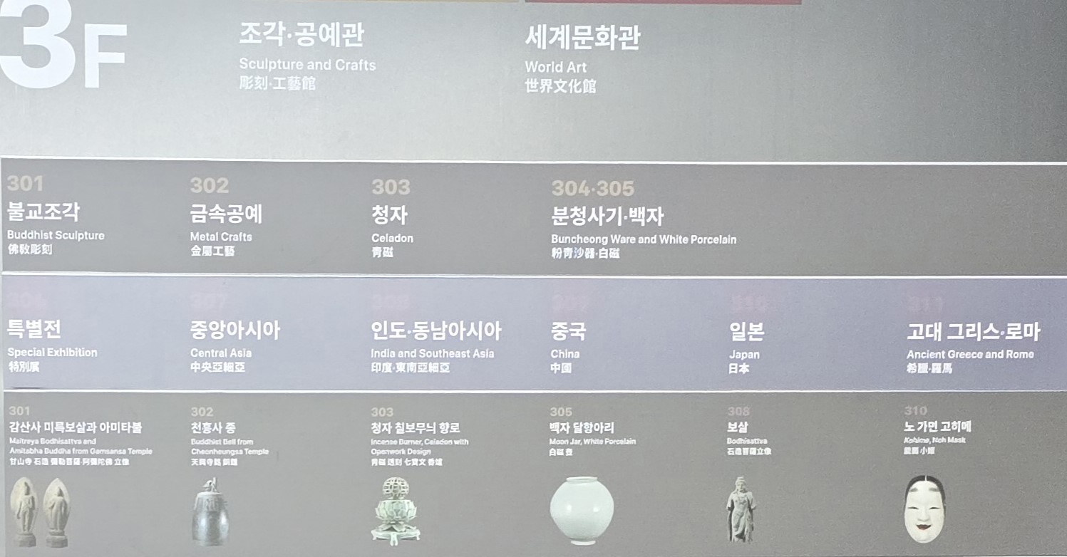 3층은 조각·공예관으로 불교조각,금속공예,청자,분청사기·백자 등을 감상할 수 있고,세계문화관에서는 중앙아시아,인도·동남아시아,중국,일본,고대그리스·로마의 유물과 유적들을 살펴볼 수 있다.