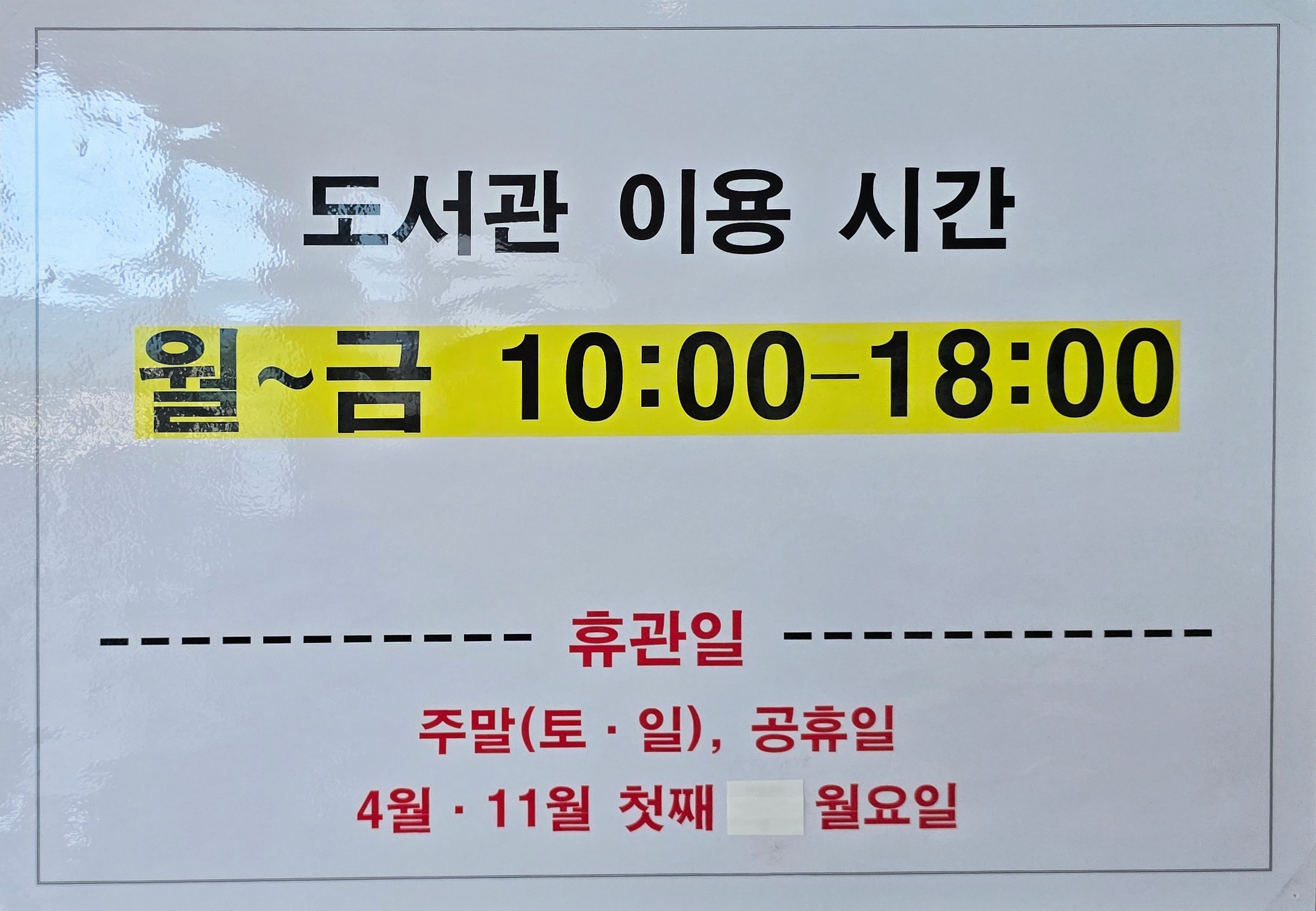 도서관 운영시간은 월~금요일 10시에서 18시까지 운영되고,휴관일은 주말,공휴일,4월과 11월 첫째 월요일 휴관이다.