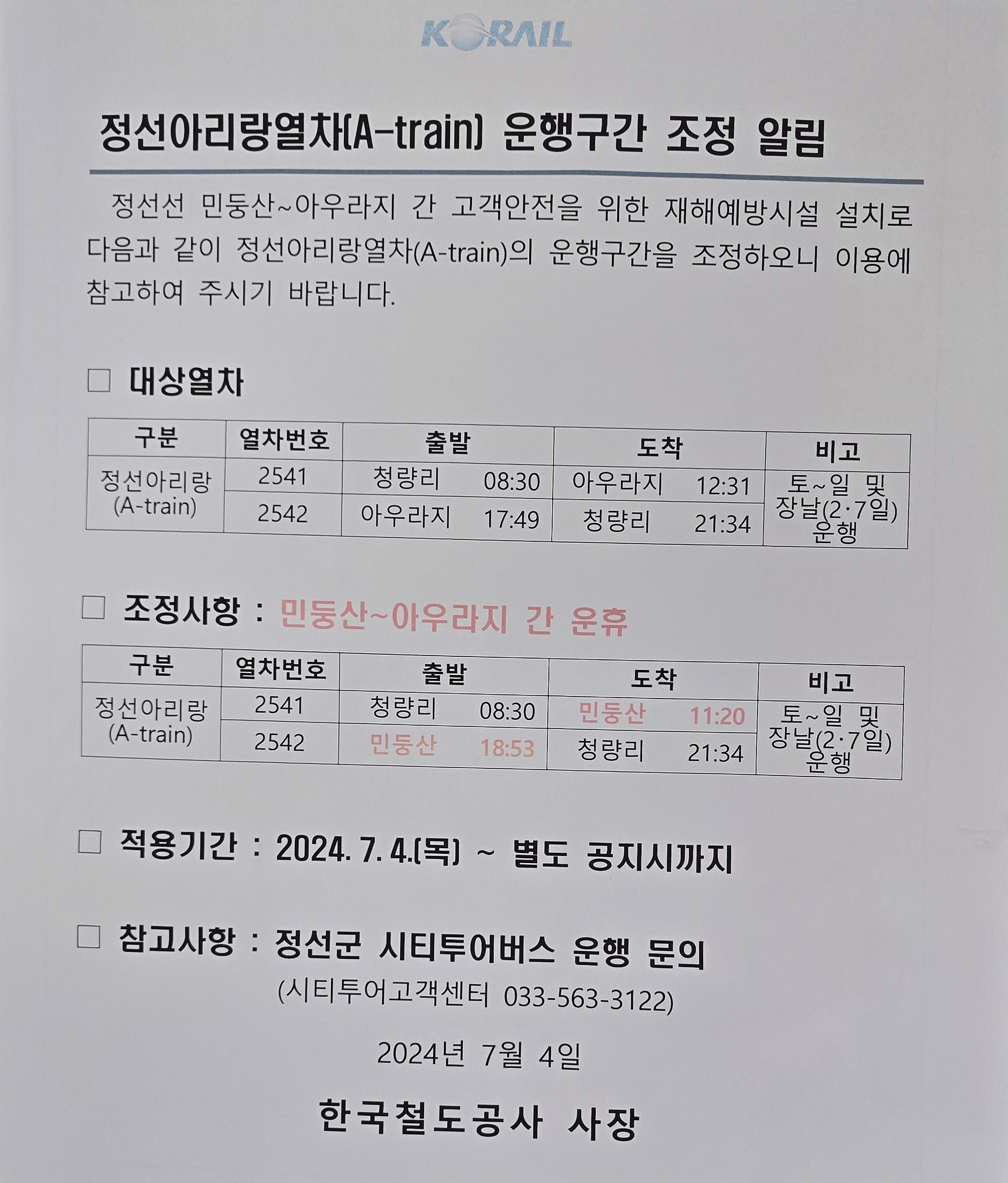 청량리역에서 아우라지까지 정선 장날인 2일,7일,그리고 토일에 운행하는 A-train 정선아리랑 열차는 2025년 11월 4일 현재는 민둥산역까지만 운행하고 있다.