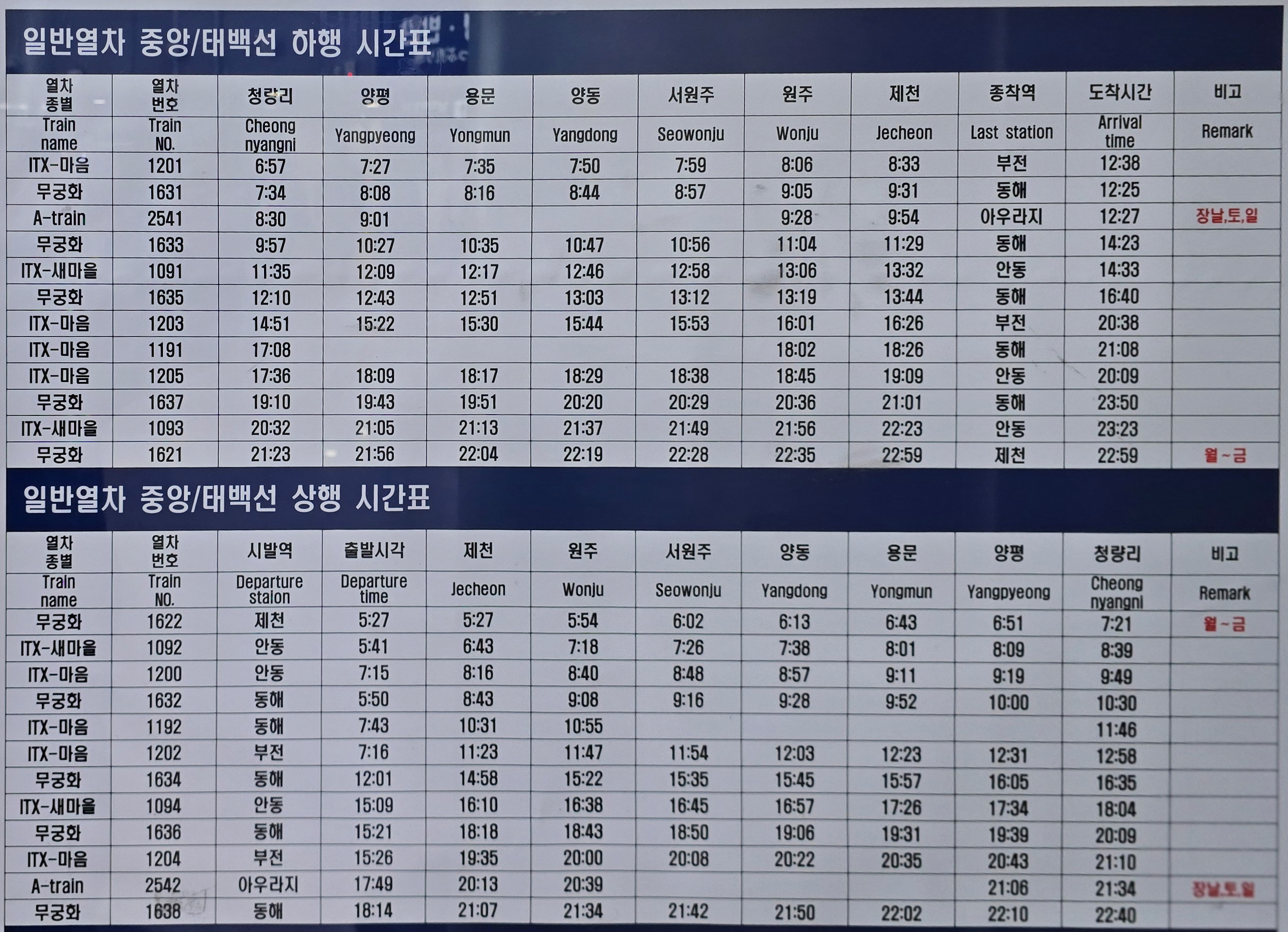 일반열차 중앙/태백선 상행시간표