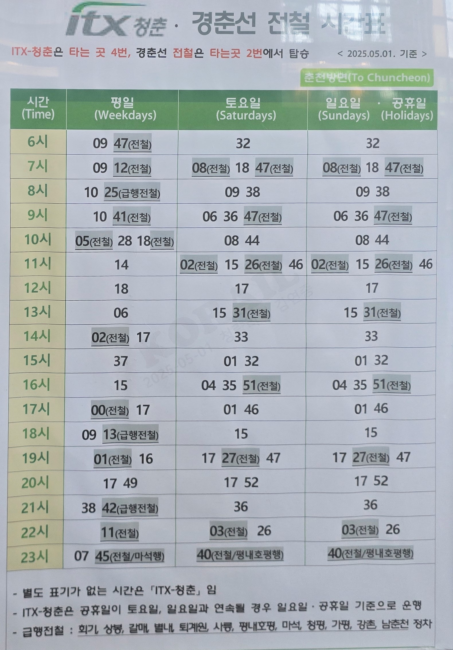 기차 시간표(2025년 11월4일 기준)