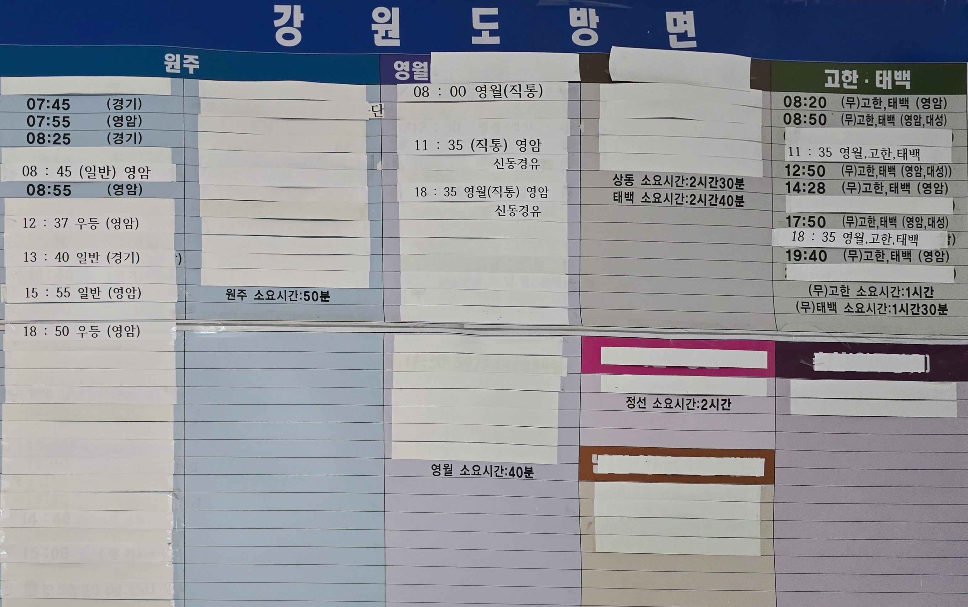 제천시외버스터미널에서 2025년 11월 7일 현재 강원도 방면 노선은 원주,영월,고한,태백 노선이 운행되고 있다.