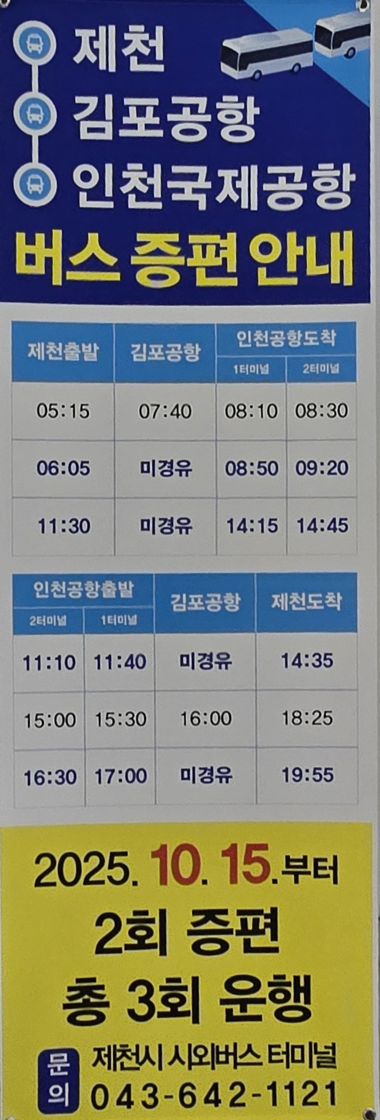 제천버스터미널에서 인천공항방면 시외버스는 2025년 10월 15일부터 하루에 2회 증편되어, 2025년 11월 7일 현재는 하루에 3회 운행되고 있다.
